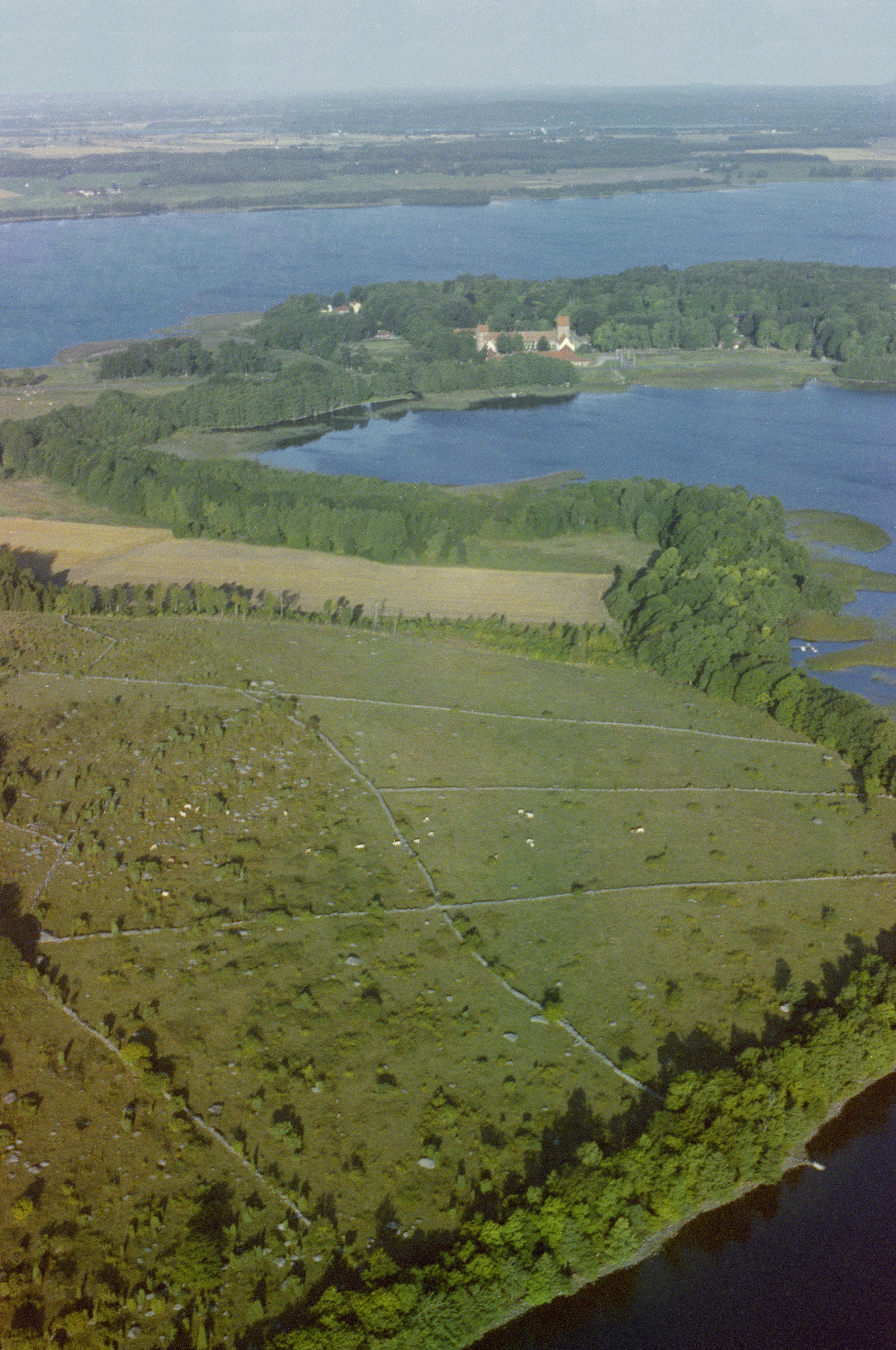 Beskrivning: Kjugekull och Skiparyd. Fornlämningsområde med bl.a. boplats RAÄnr Kiaby 89:1 och stenkrets Kiaby 43:1-3 vid bildens mitt. I bildens övre del Bäckaskogs slott. Bilden är tagen mot (väderstreck): NV