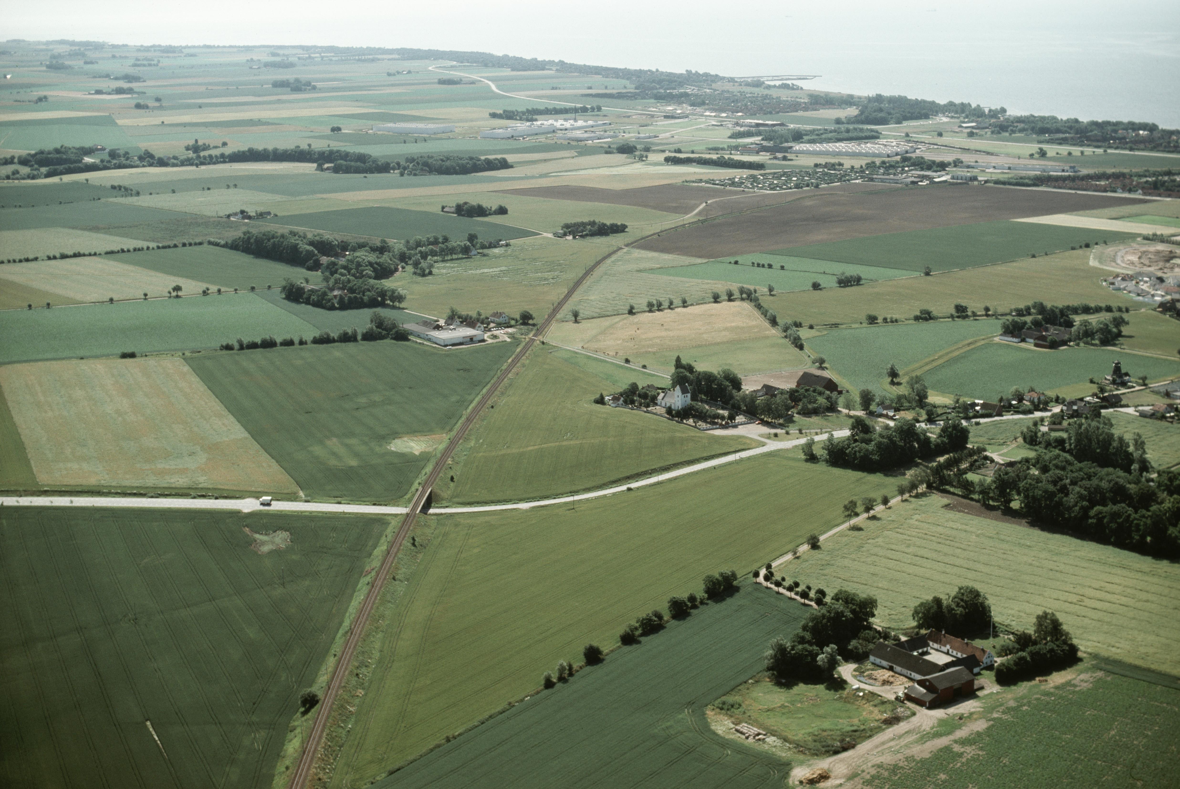 Beskrivning: Kyrkoköpinge kyrka till höger om bildens mitt. I bildens övre del Dalköpinge socken. Bilden är tagen mot (väderstreck): SO