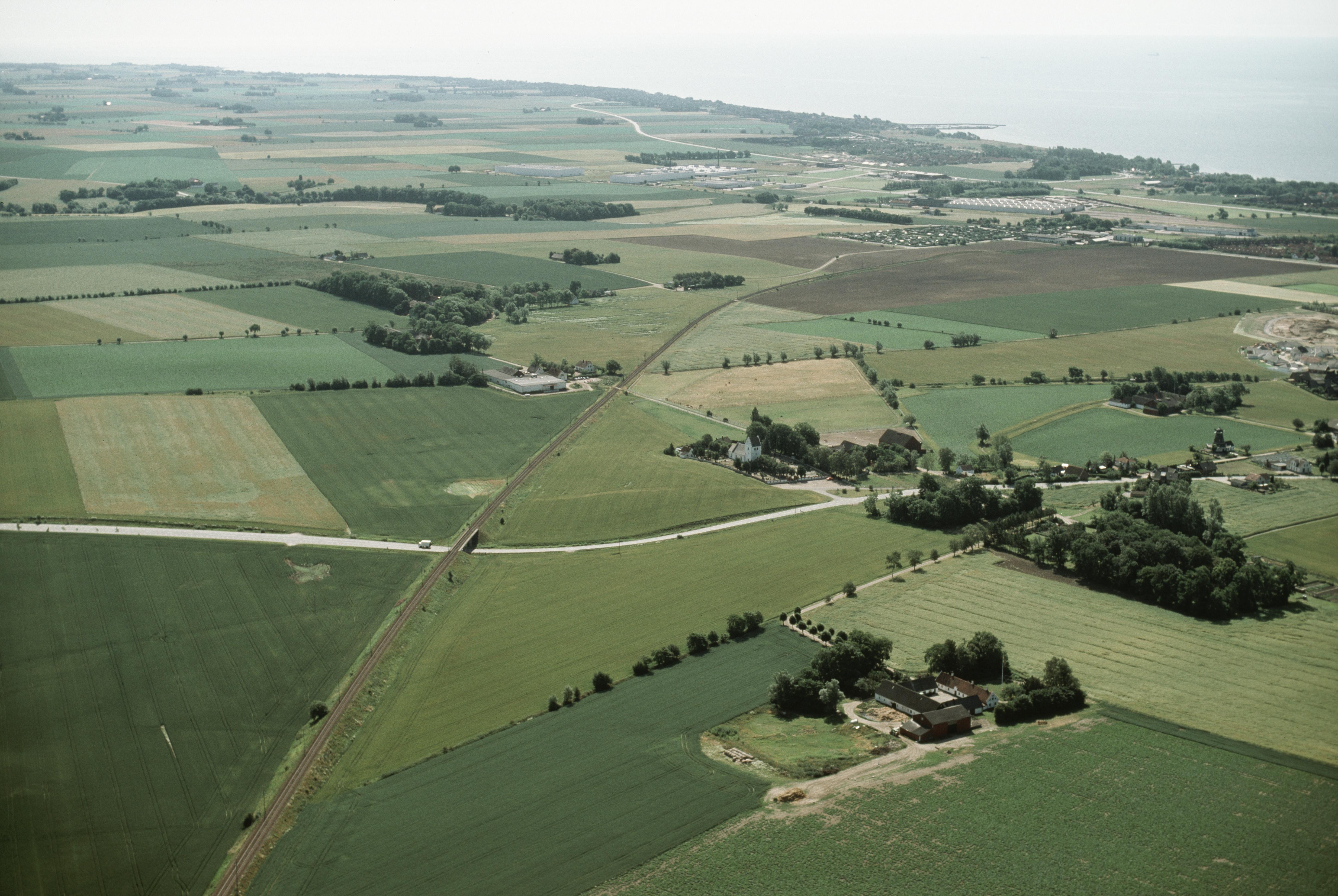 Beskrivning: Kyrkoköpinge kyrka till höger om bildens mitt. I bildens övre del Dalköpinge socken. Bilden är tagen mot (väderstreck): SO