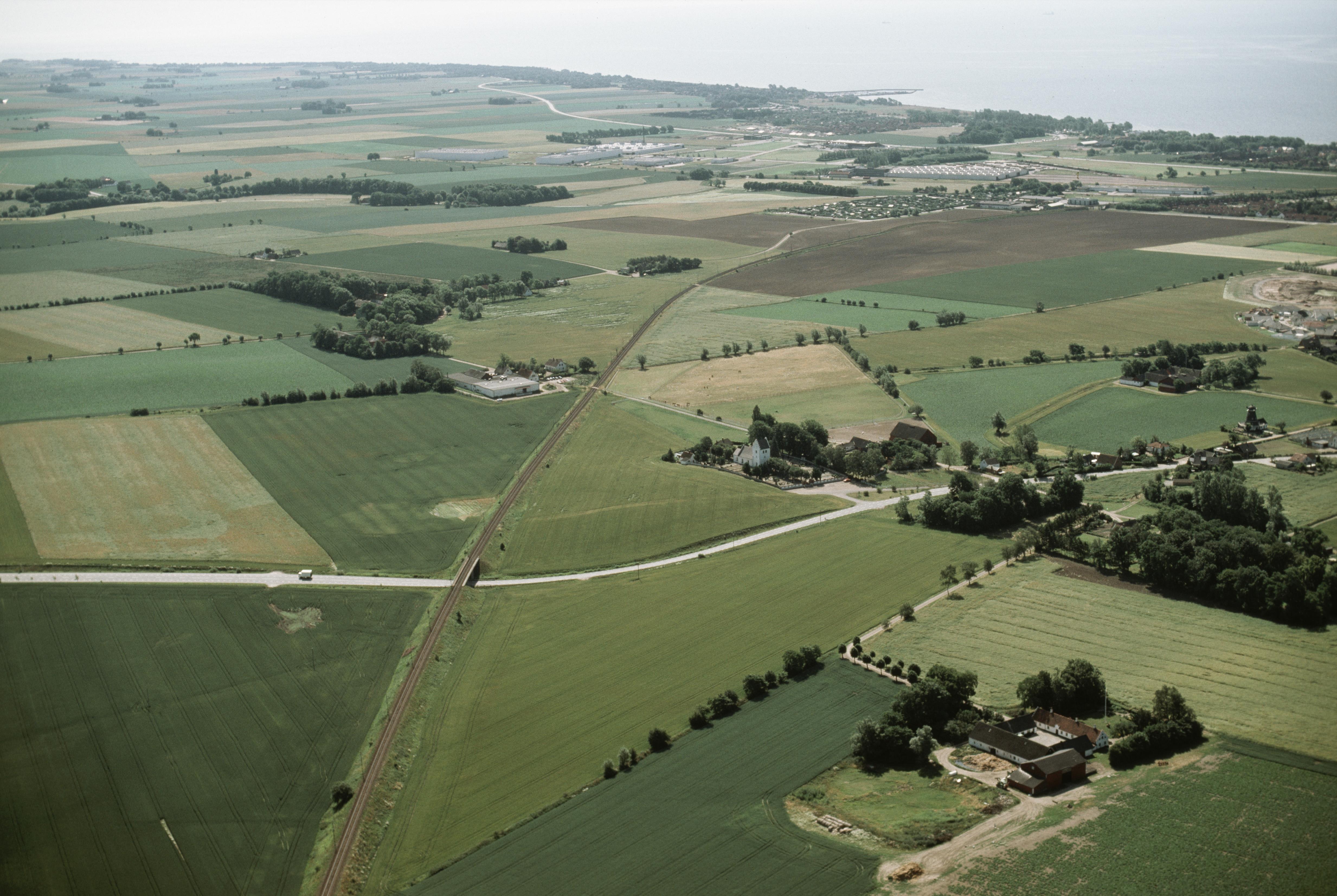 Beskrivning: Kyrkoköpinge kyrka till höger. I bildens övre del Dalköpinge socken. Bilden är tagen mot (väderstreck): SO