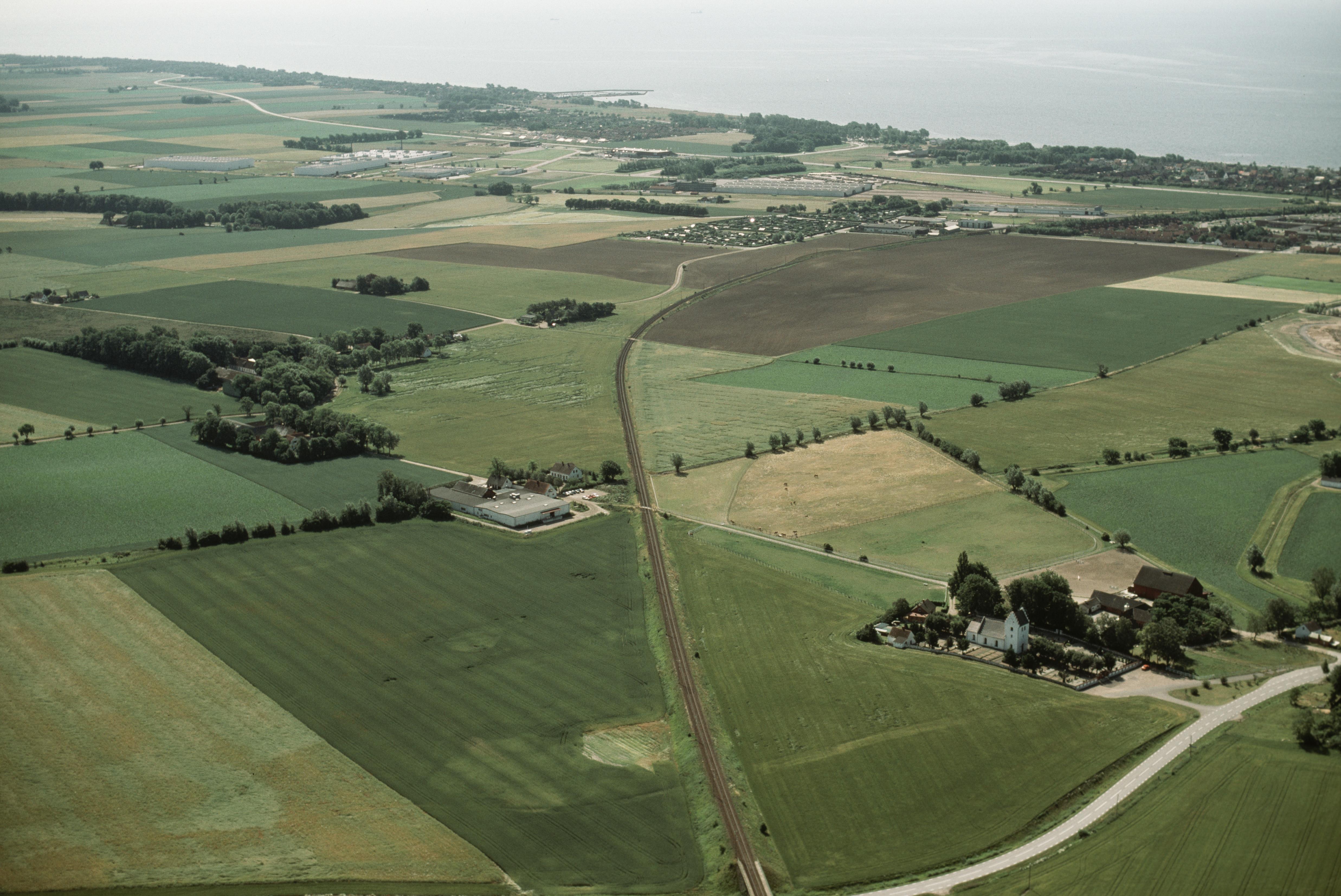 Beskrivning: Kyrkoköpinge kyrka till höger. I bildens övre del Dalköpinge socken. Bilden är tagen mot (väderstreck): SO