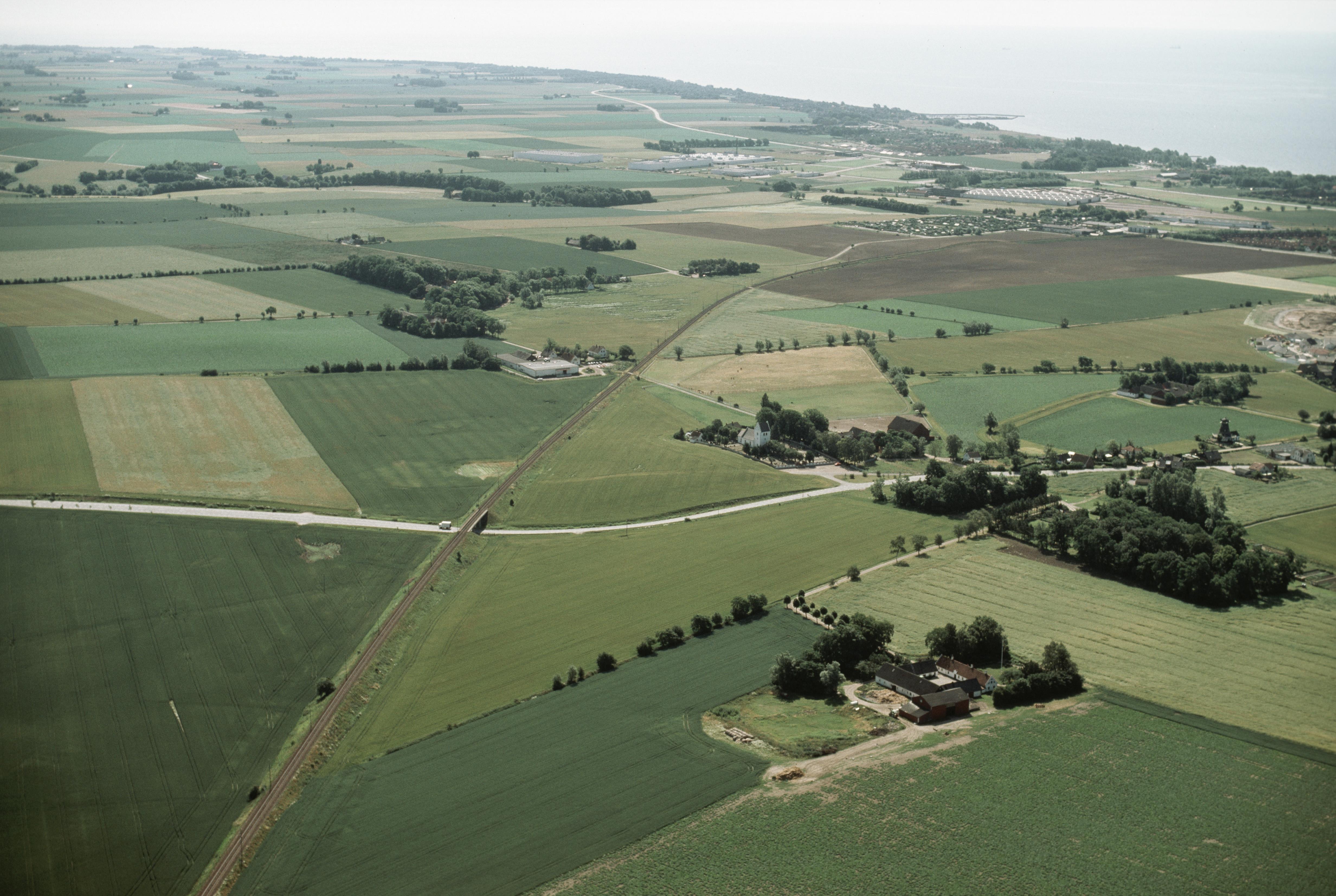 Beskrivning: Kyrkoköpinge kyrka till höger. I bildens övre del Dalköpinge socken. Bilden är tagen mot (väderstreck): SO