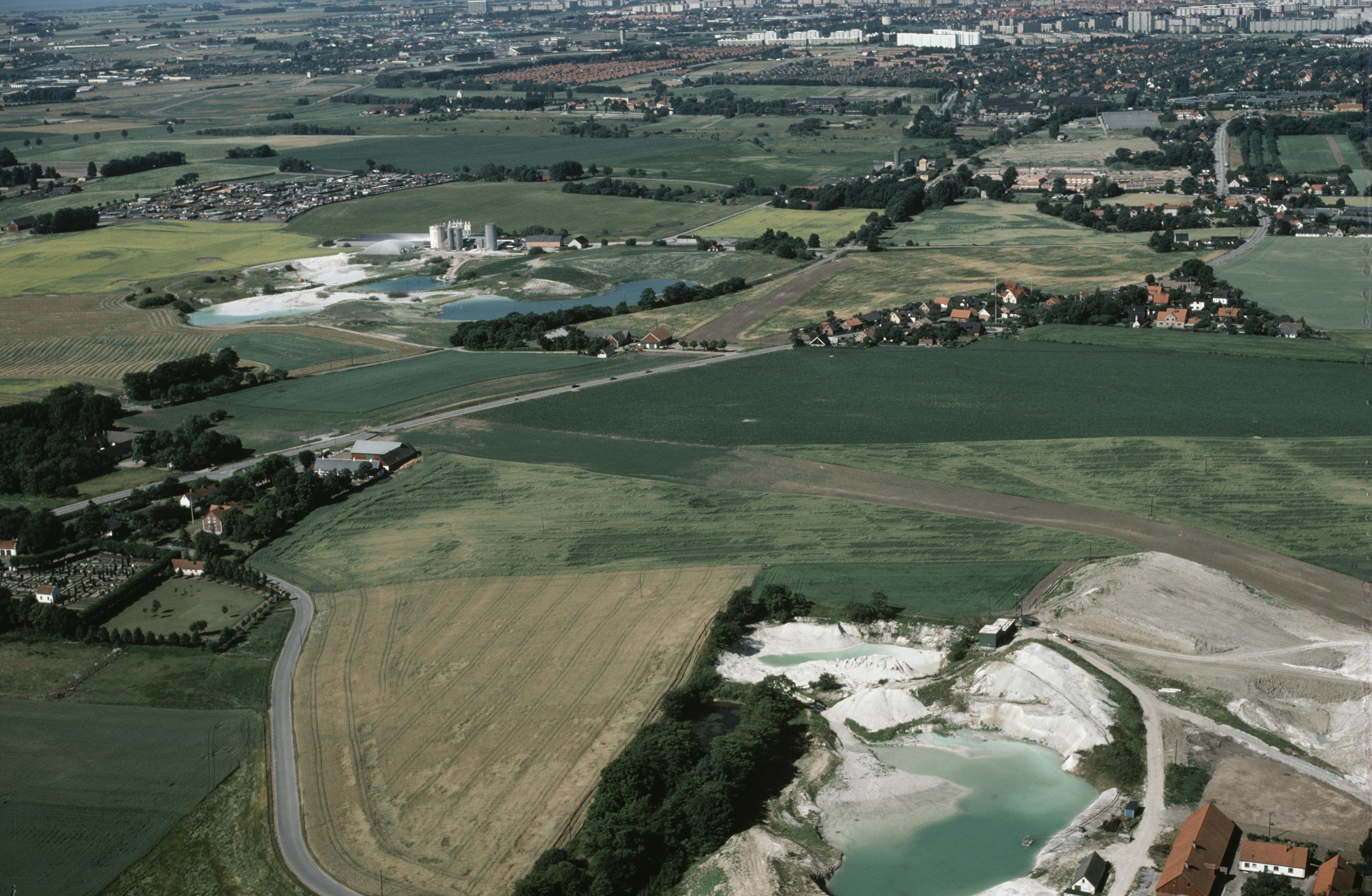 Beskrivning: Södra Sallerups kyrka till vänster. Flintgruvor i f.d. socknet Södra Sallerup (sen 1952 en del av Malmö stad / socken). I bildens övre del Kvarnby och Malmö stad. Bilden är tagen mot (väderstreck): SV