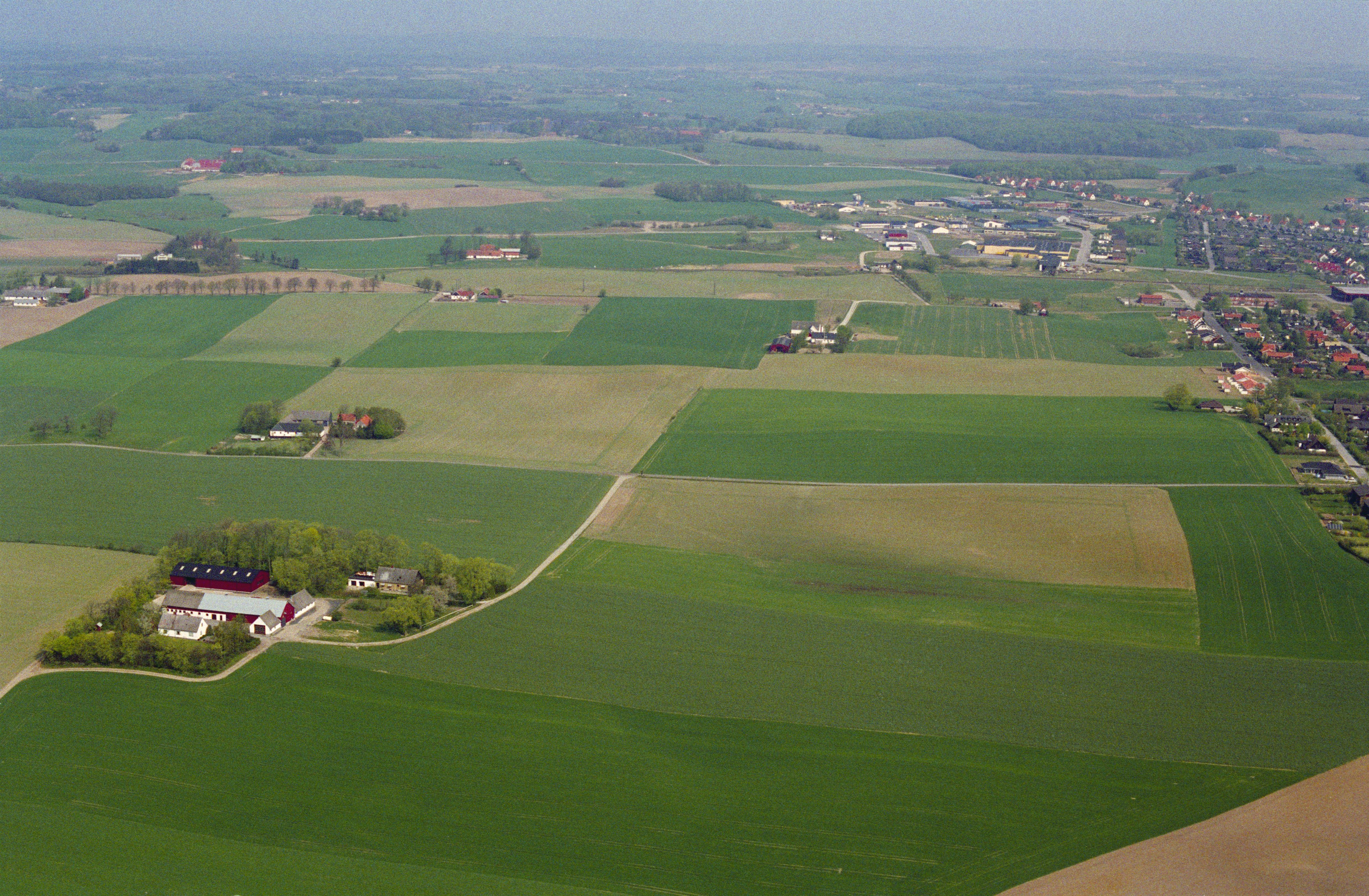 Beskrivning: MacLeans åkrar i området vid Saritslöv. I bildens vänstra del kyrkoruin och ödekyrkogård RAÄnr Skurup 12:1-2. Nere till vänster gården Elinelund. Bilden är tagen mot (väderstreck): N
