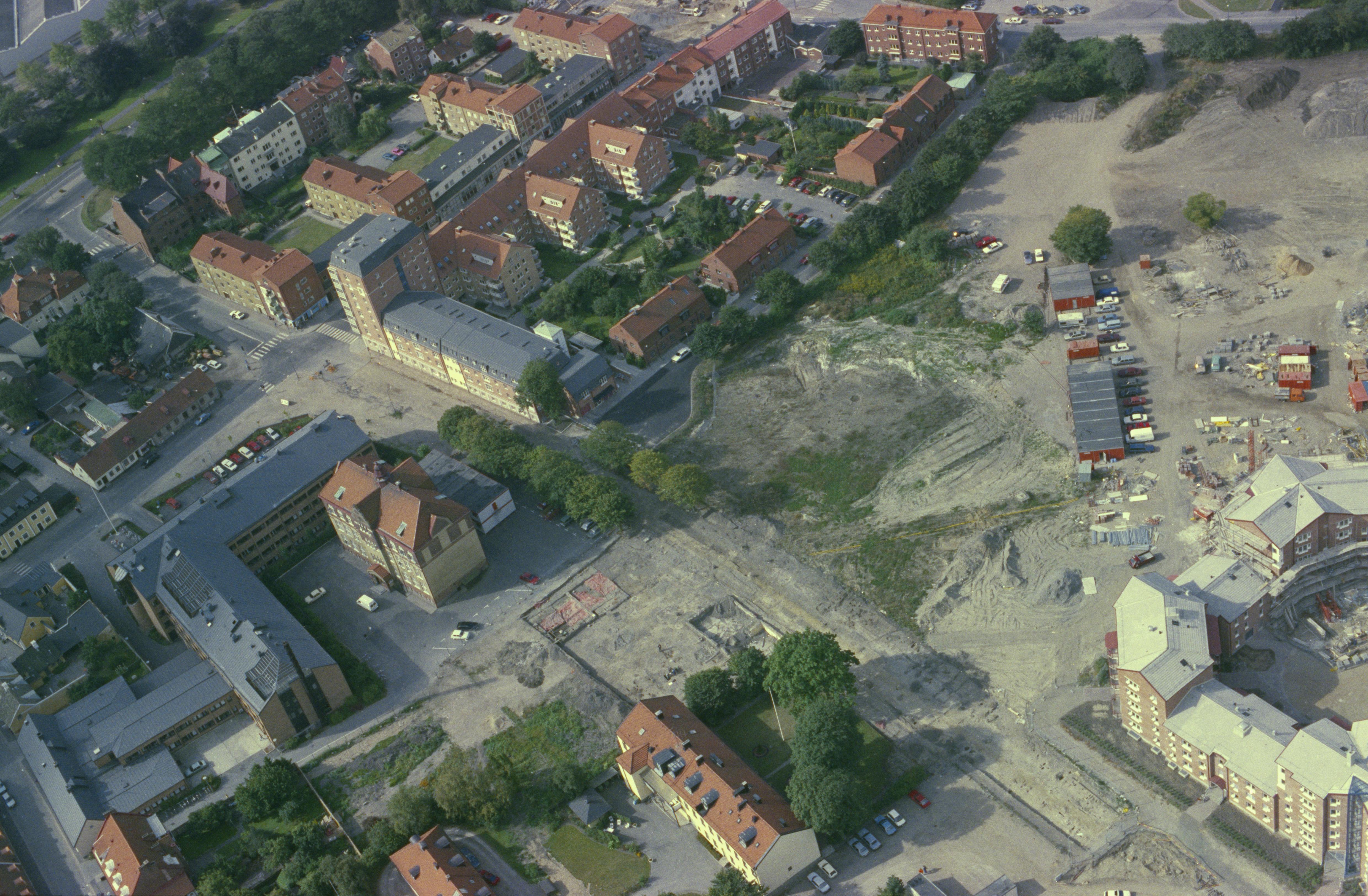 Beskrivning: Trelleborgs stad. Arkeologisk undersökning av fornborg "Trelleborgen" RAÄnr Trelleborg 48 vid bildens mitt. Bilden är tagen mot (väderstreck): VSV