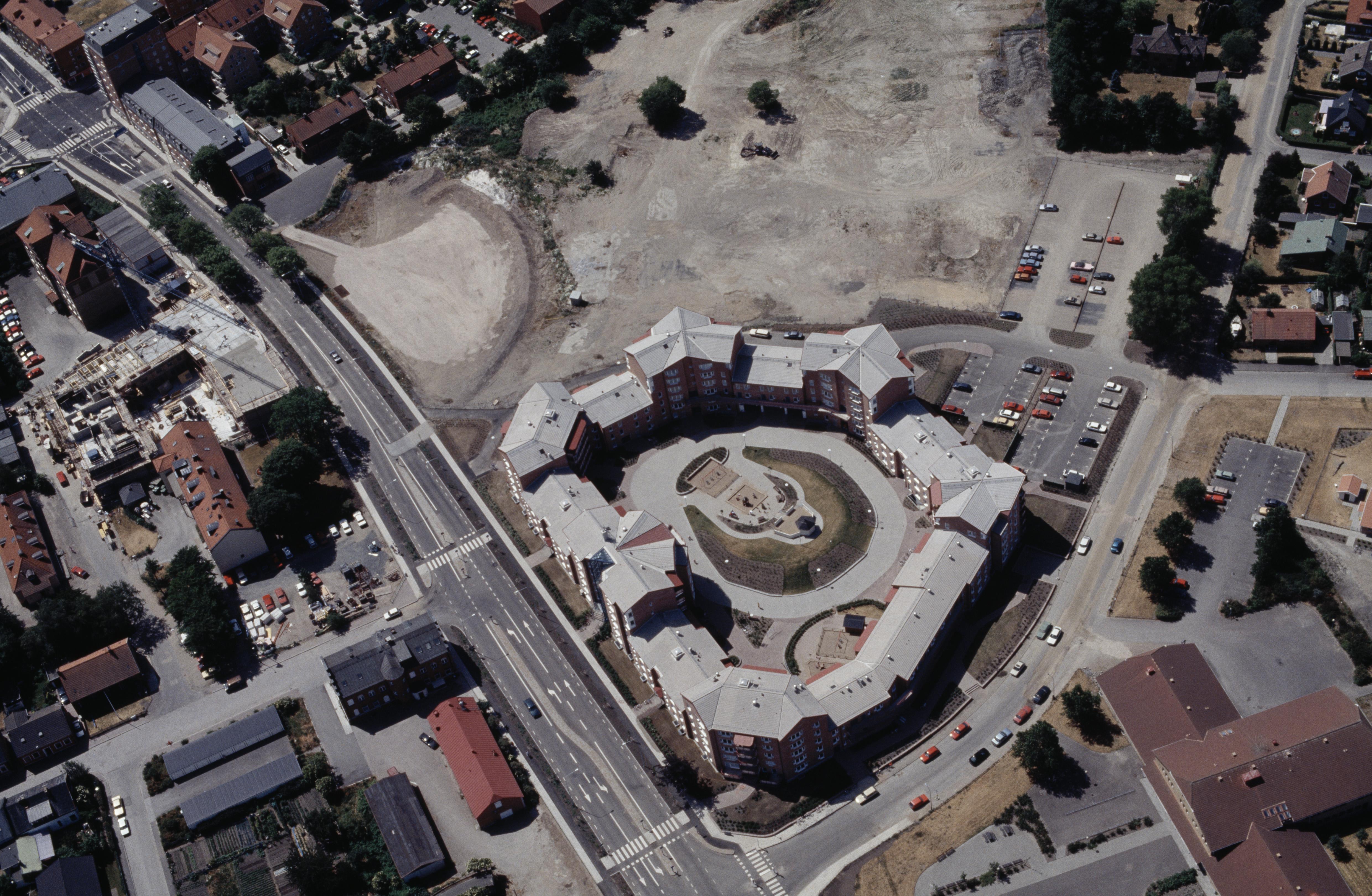 Beskrivning: Trelleborgs stad. Trelleborgs sjöfartsmuseum. Arkeologisk undersökning av fornborg "Trelleborgen" RAÄnr Trelleborg 48 i bildens övre del. Bilden är tagen mot (väderstreck): SV