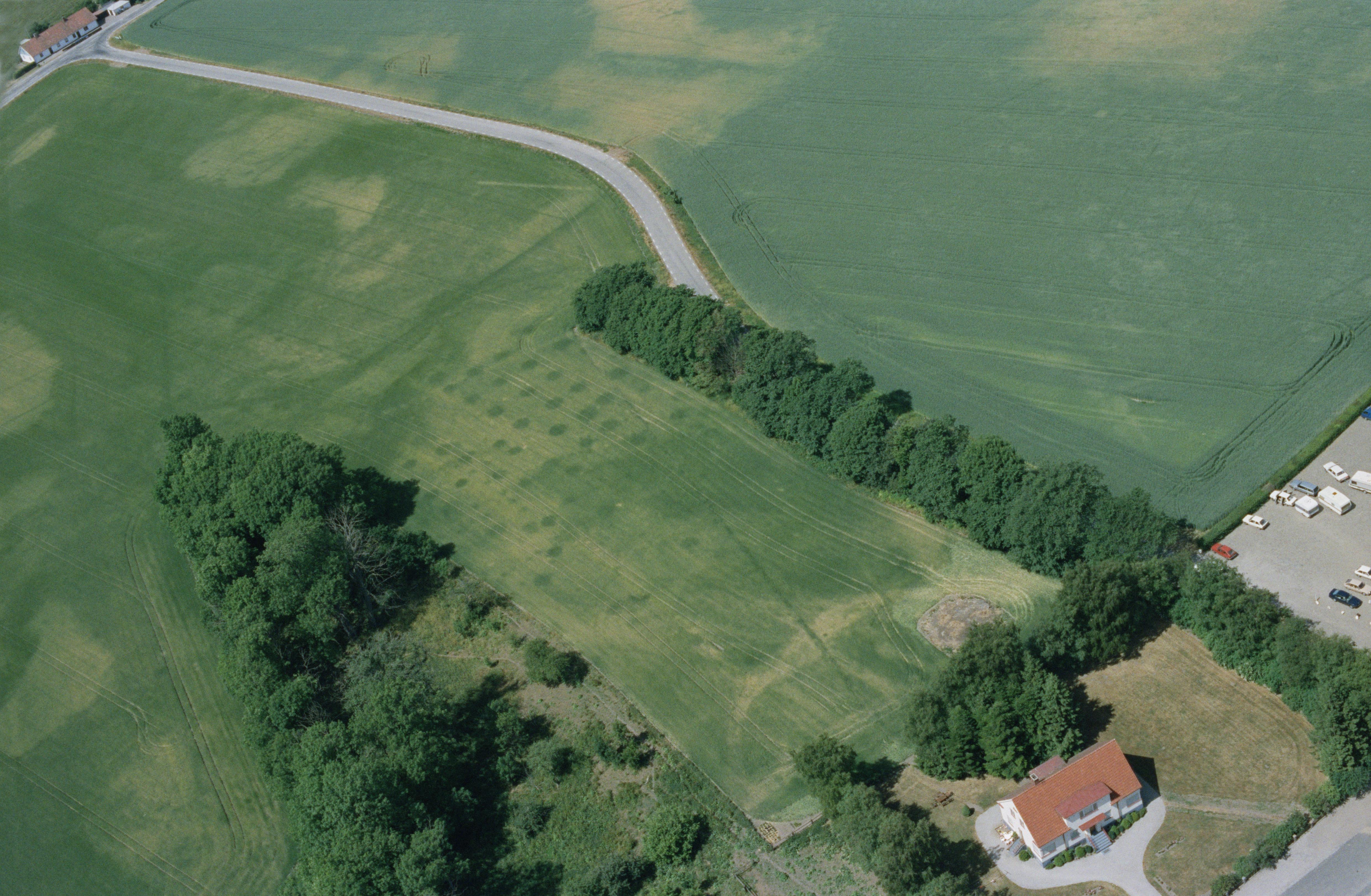 Beskrivning: Cropmarks efter borttagen äppelträdgård på västra sidan av Glimmingehus borg RAÄnr Vallby 5:1. Bilden är tagen mot (väderstreck): N