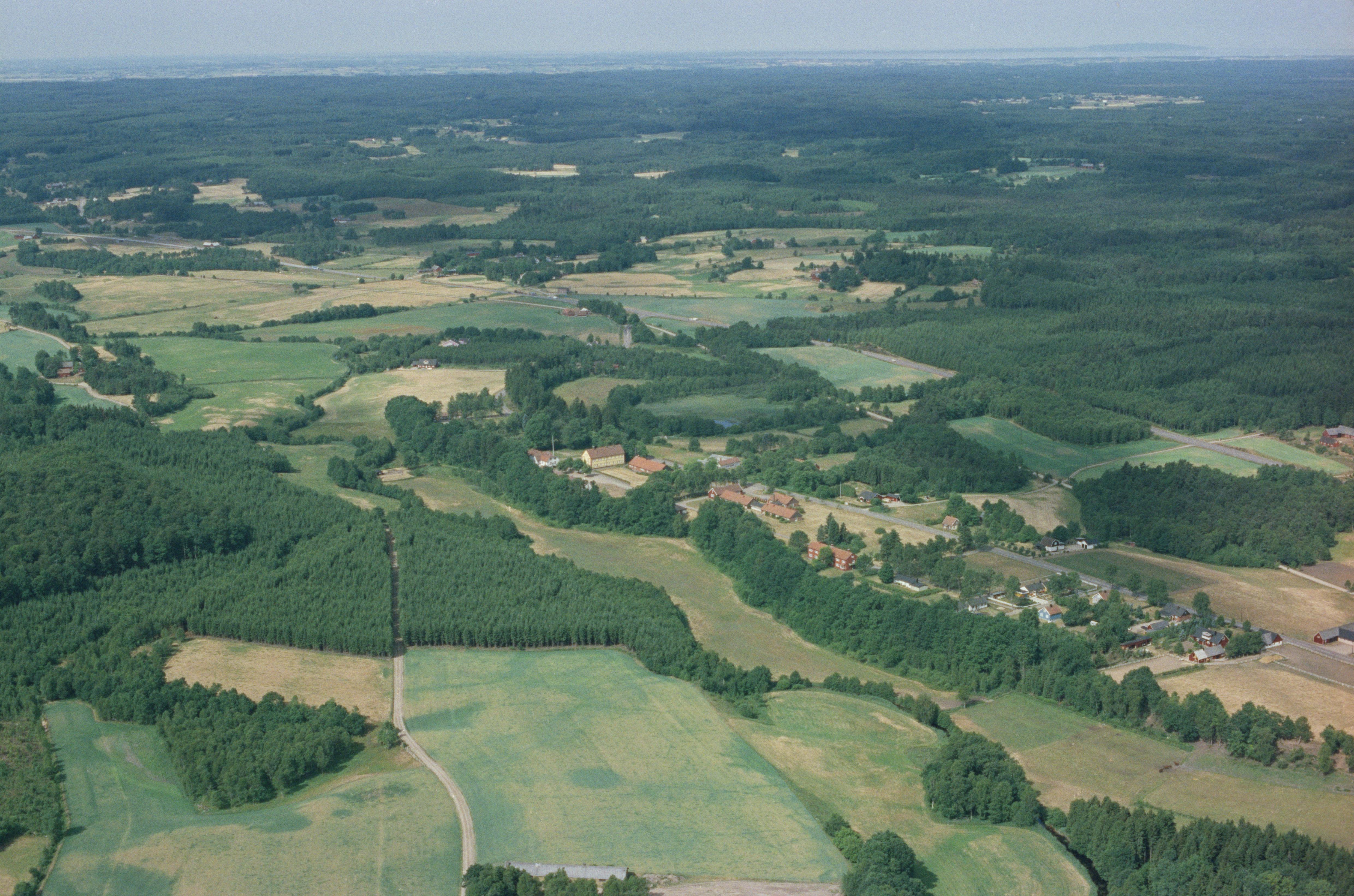 Beskrivning: Pinnån på gränsen mellan socknen Rya och Örkelljunga (i bildens nedre del). Ryagården Yrkesskola och blästbrukslämning RAÄnr Rya 13:1 vid bildens mitt. Bilden är tagen mot (väderstreck): V