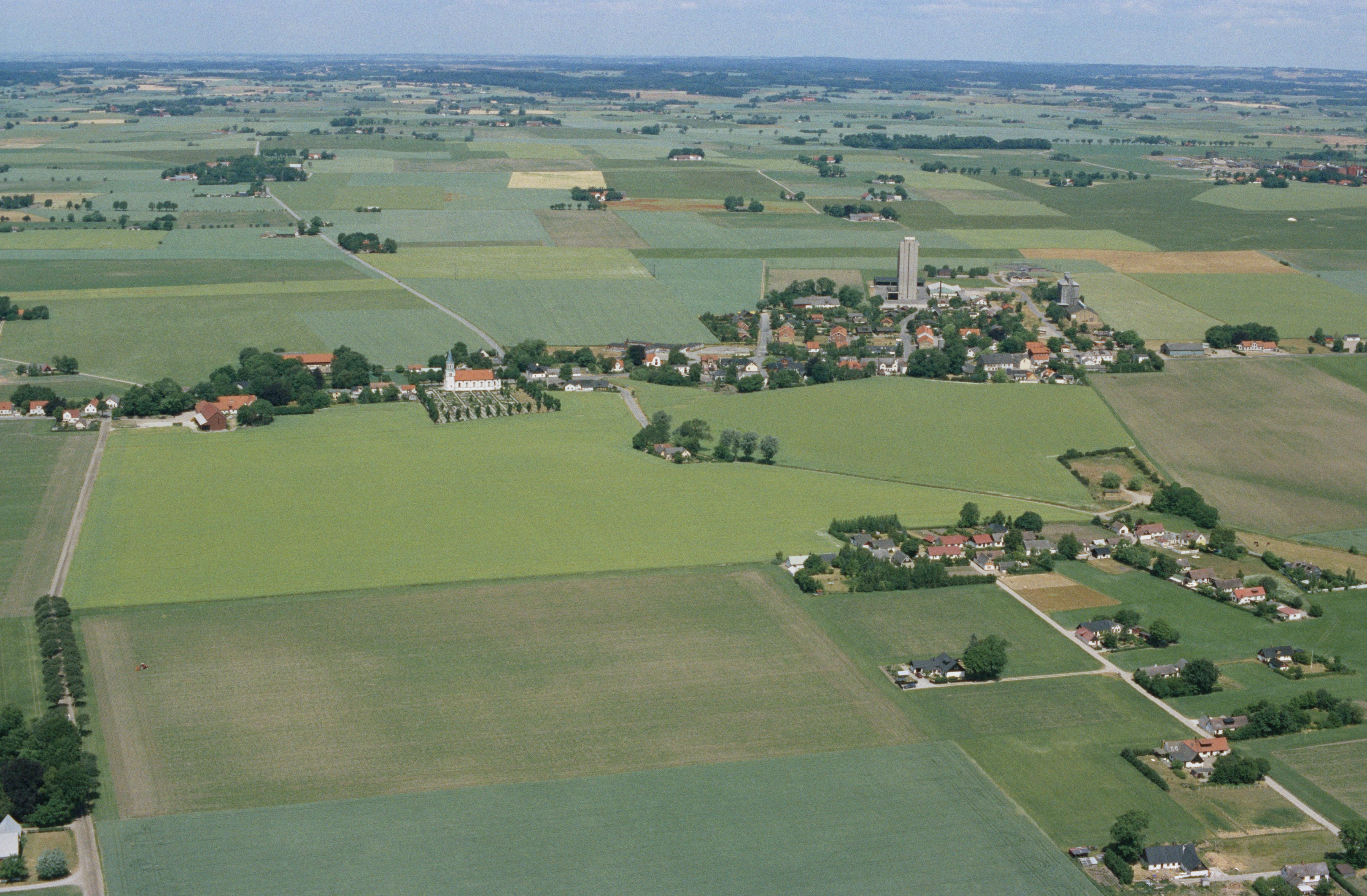 Beskrivning: Östra Klagstorps kyrka och kyrkby. Bilden är tagen mot (väderstreck): N
