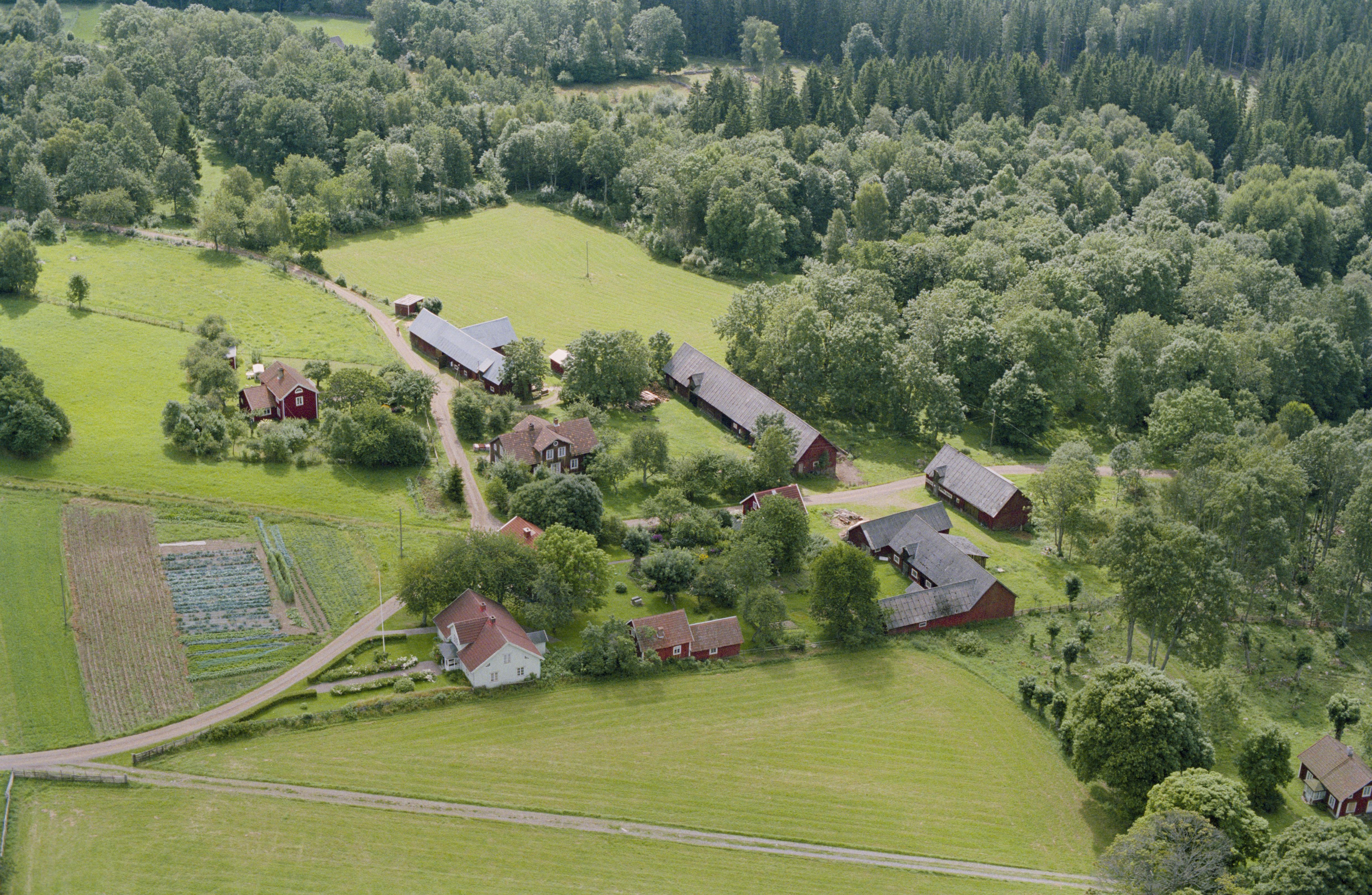 Beskrivning: Bökevara by. Till höger över bildens mitt Soldatkällan med husgrund RAÄnr Algutsboda 75:1-2. Bilden är tagen mot (väderstreck): S