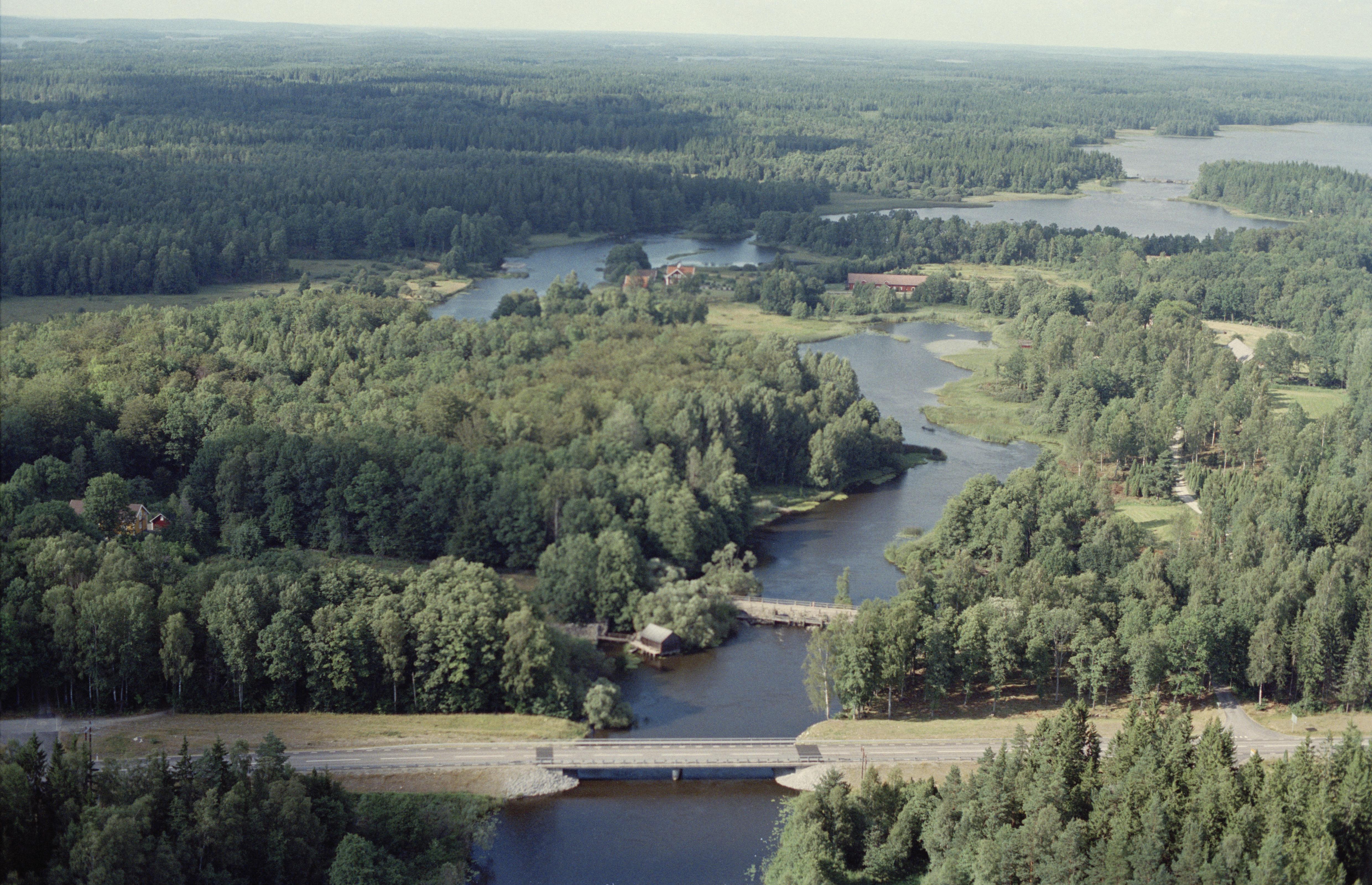Beskrivning: Under bildens mitt Holmabron RAÄnr Almundsryd 107:1 över Mörrumsån . I bildens övre del Blidingsholms gård. Bilden är tagen mot (väderstreck): N