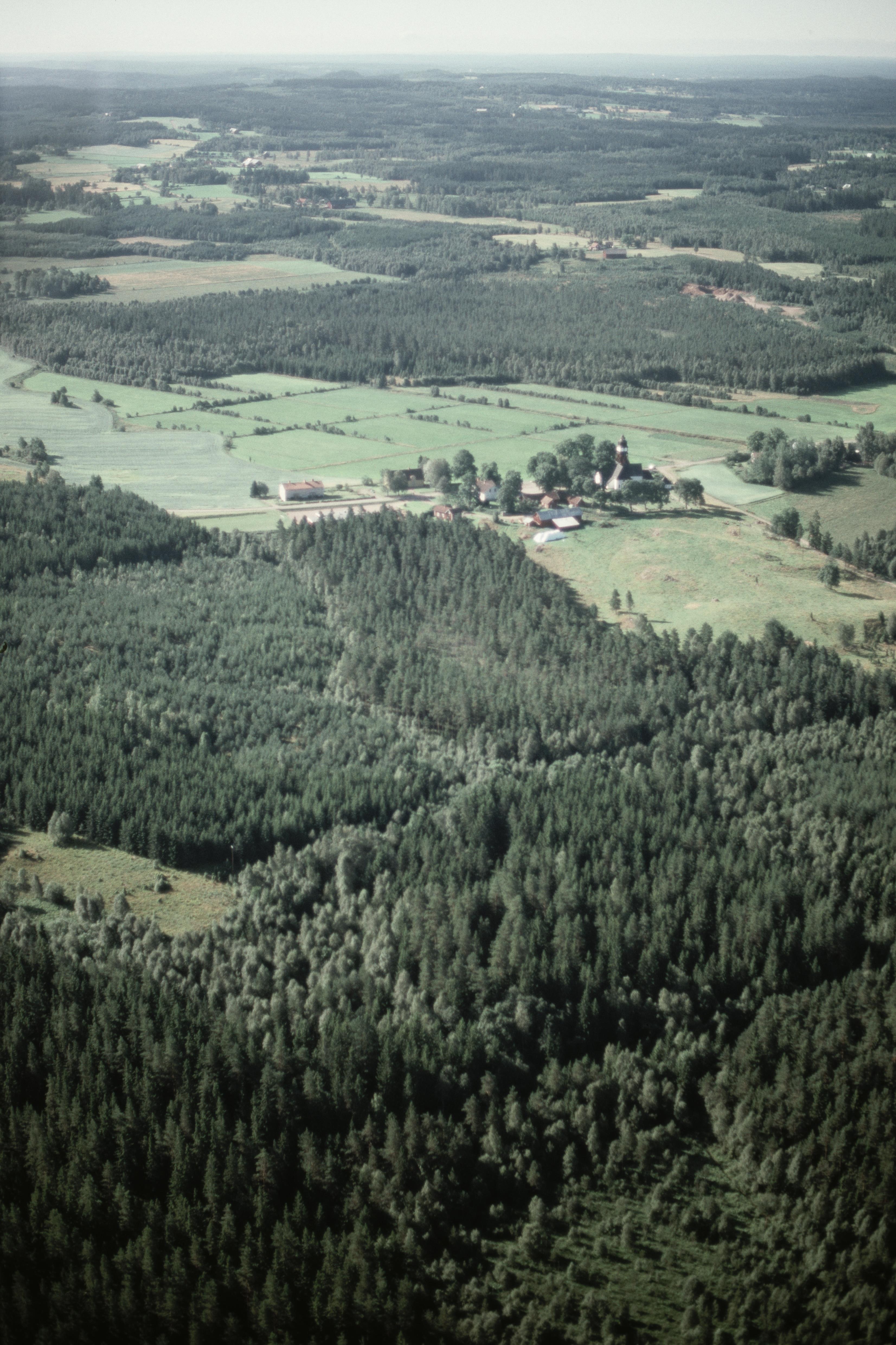 Beskrivning: Fossil åker RAÄnr Askeryd 419 vid bildens mitt. Askeryds kyrka och kyrkby i bildens övre del. Bilden är tagen mot (väderstreck): S