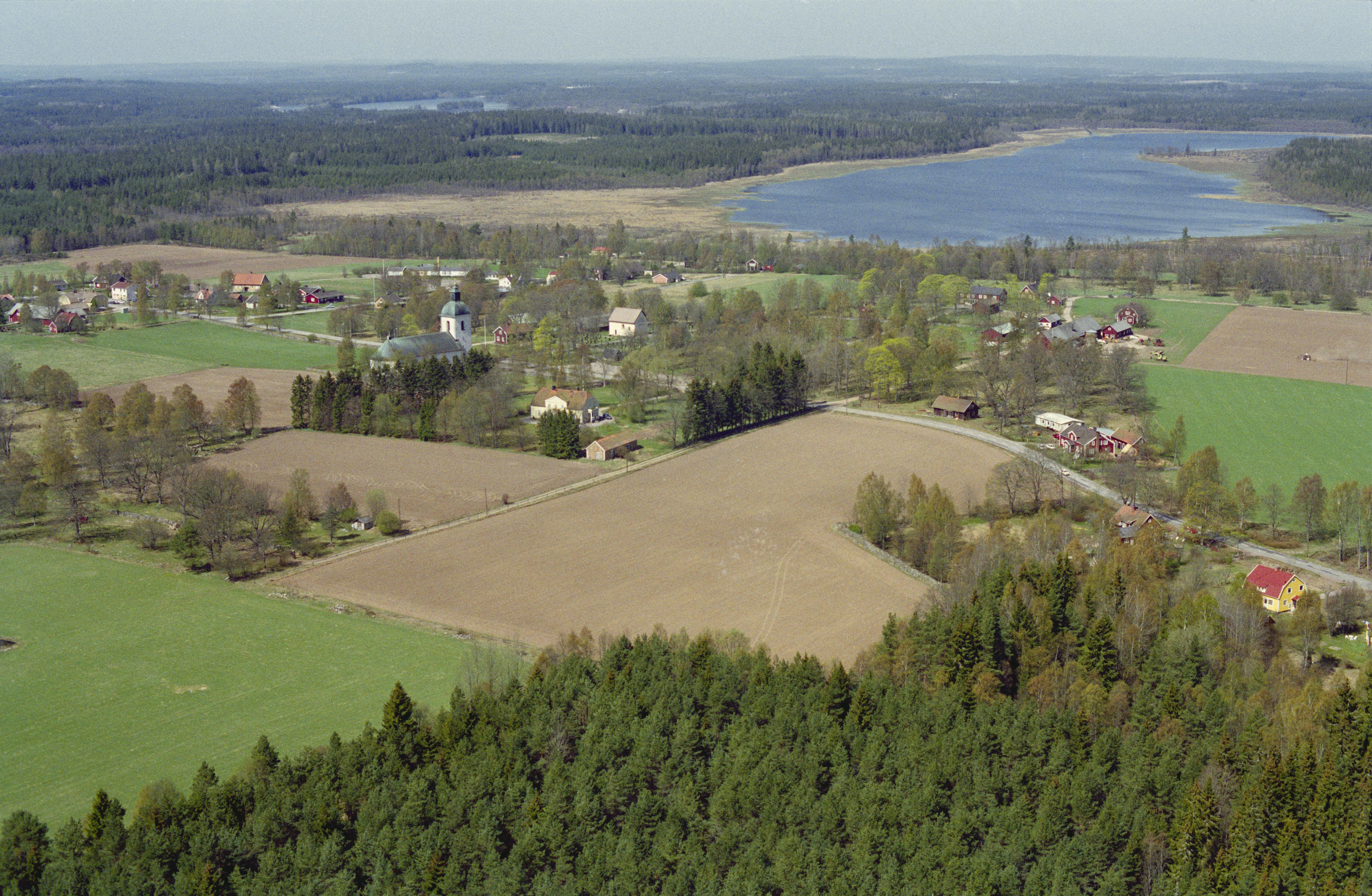 Beskrivning: Dädesjö gamla kyrka och Dädesjö nya kyrka. I bildens övre del sjön Dällingen. Bilden är tagen mot (väderstreck): NV