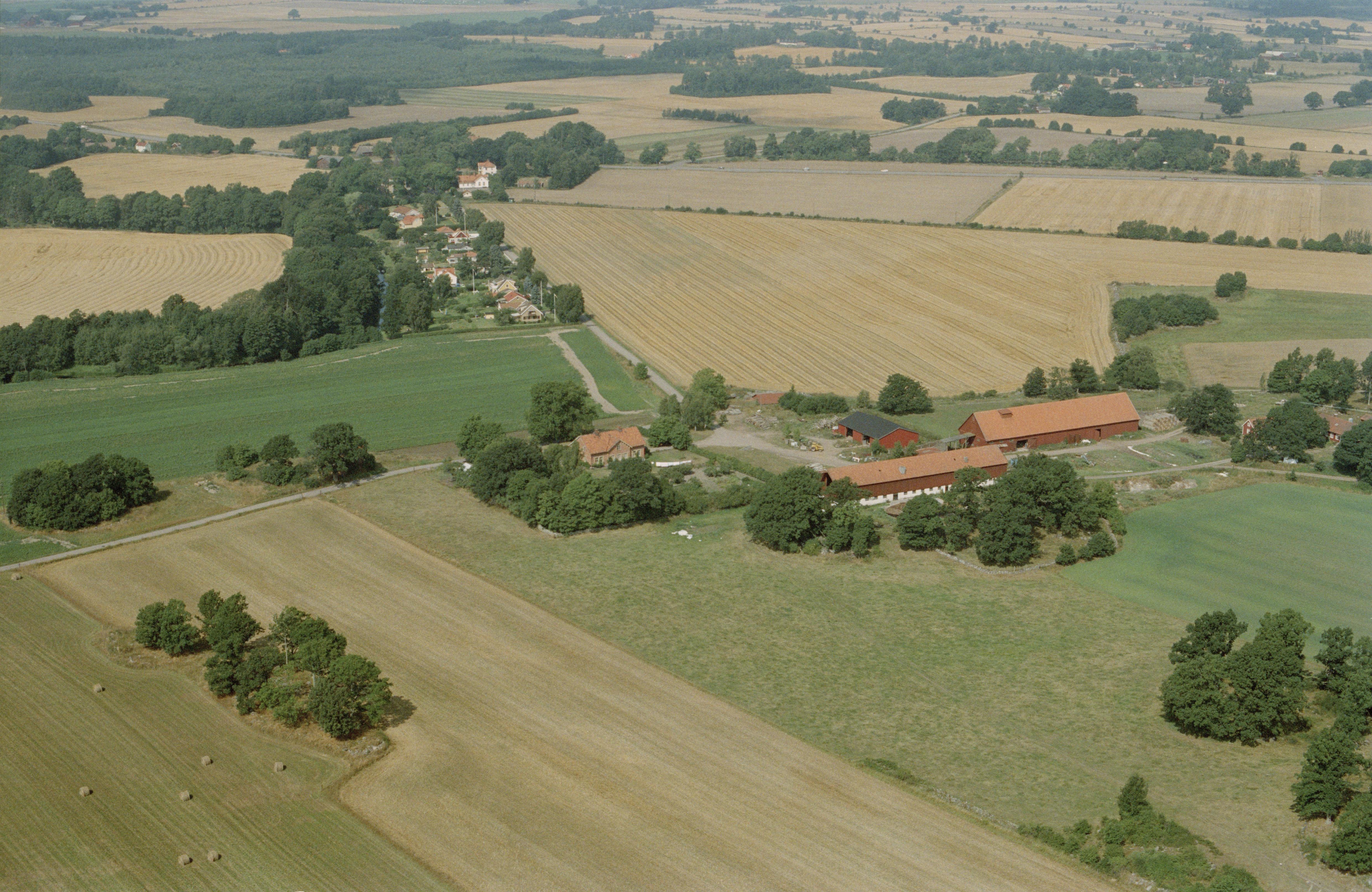 Beskrivning: Hossmo herrgård / säteri / kungsgård. Till vänster i bildens övre del Hossmo kyrka vid Ljungbyån. Bilden är tagen mot (väderstreck): V