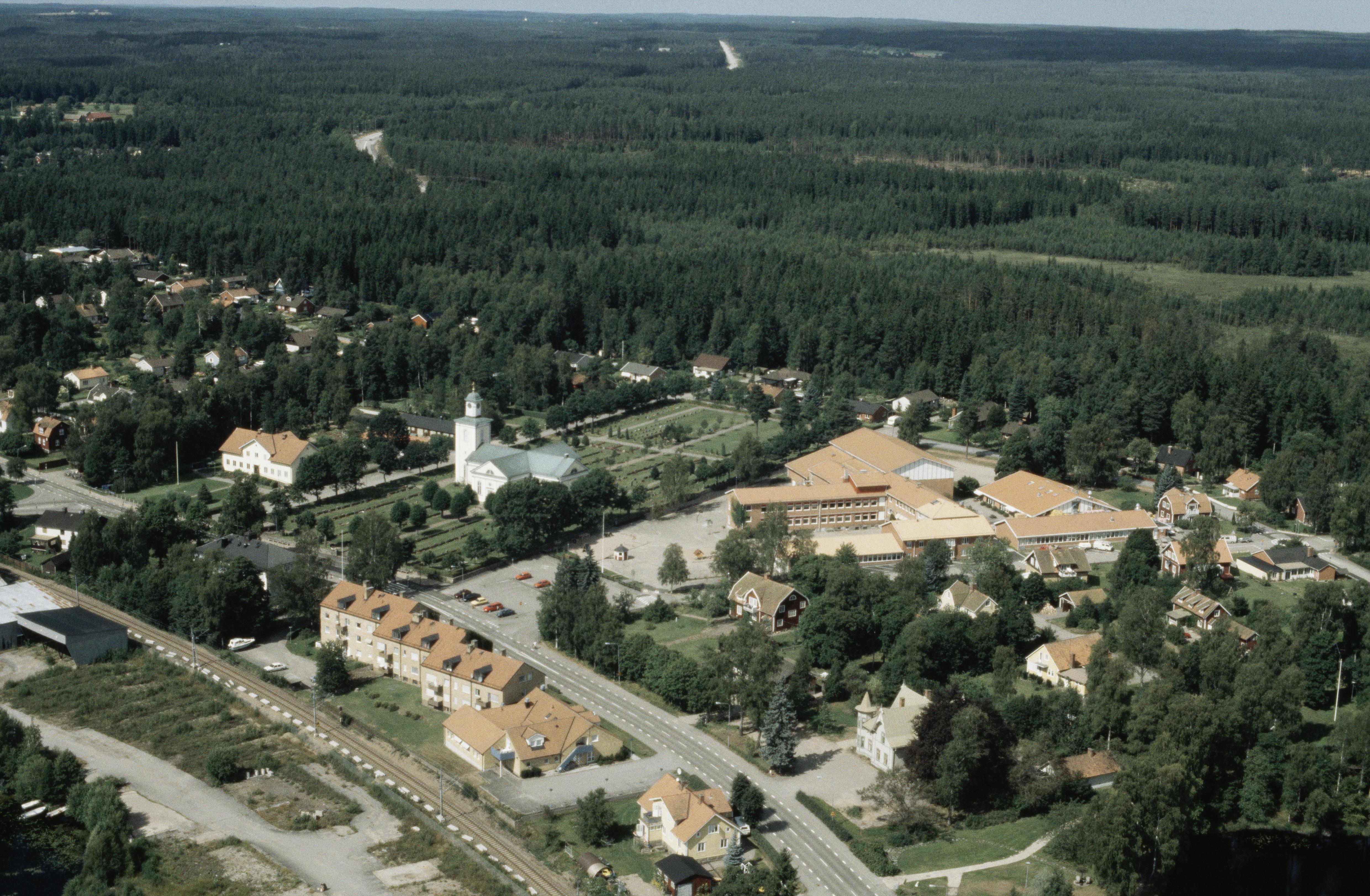 Beskrivning: Hovmantorps tätort. Hovmantorps kyrka vid bildens mitt. Bilden är tagen mot (väderstreck): NV