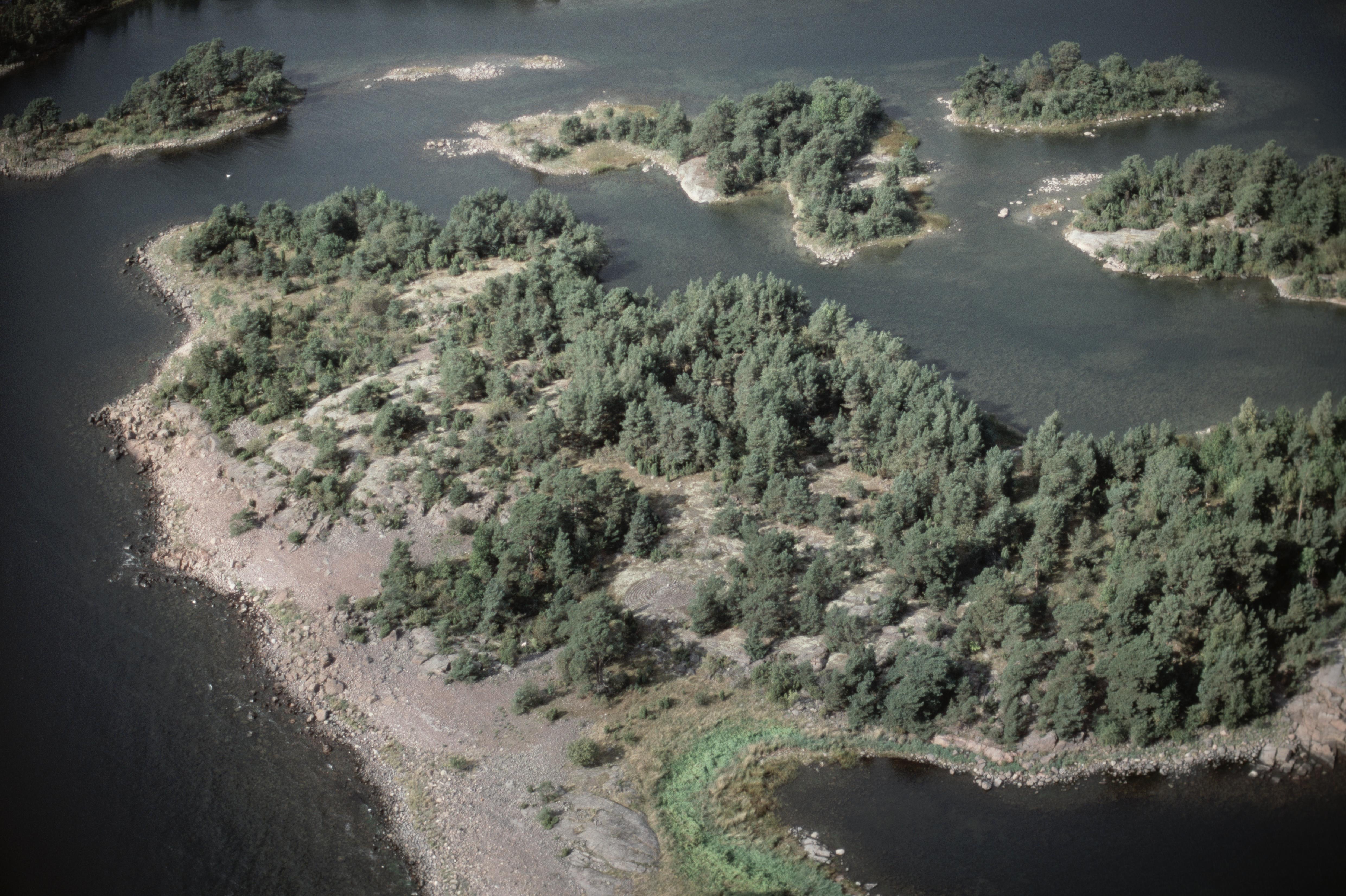 Beskrivning: Stora Kyrkgångsskär med omkransande öar i södra delen av Misterhults skärgård. Labyrint RAÄnr Misterhult 407:1 vid bildens mitt. Bilden är tagen mot (väderstreck): NV