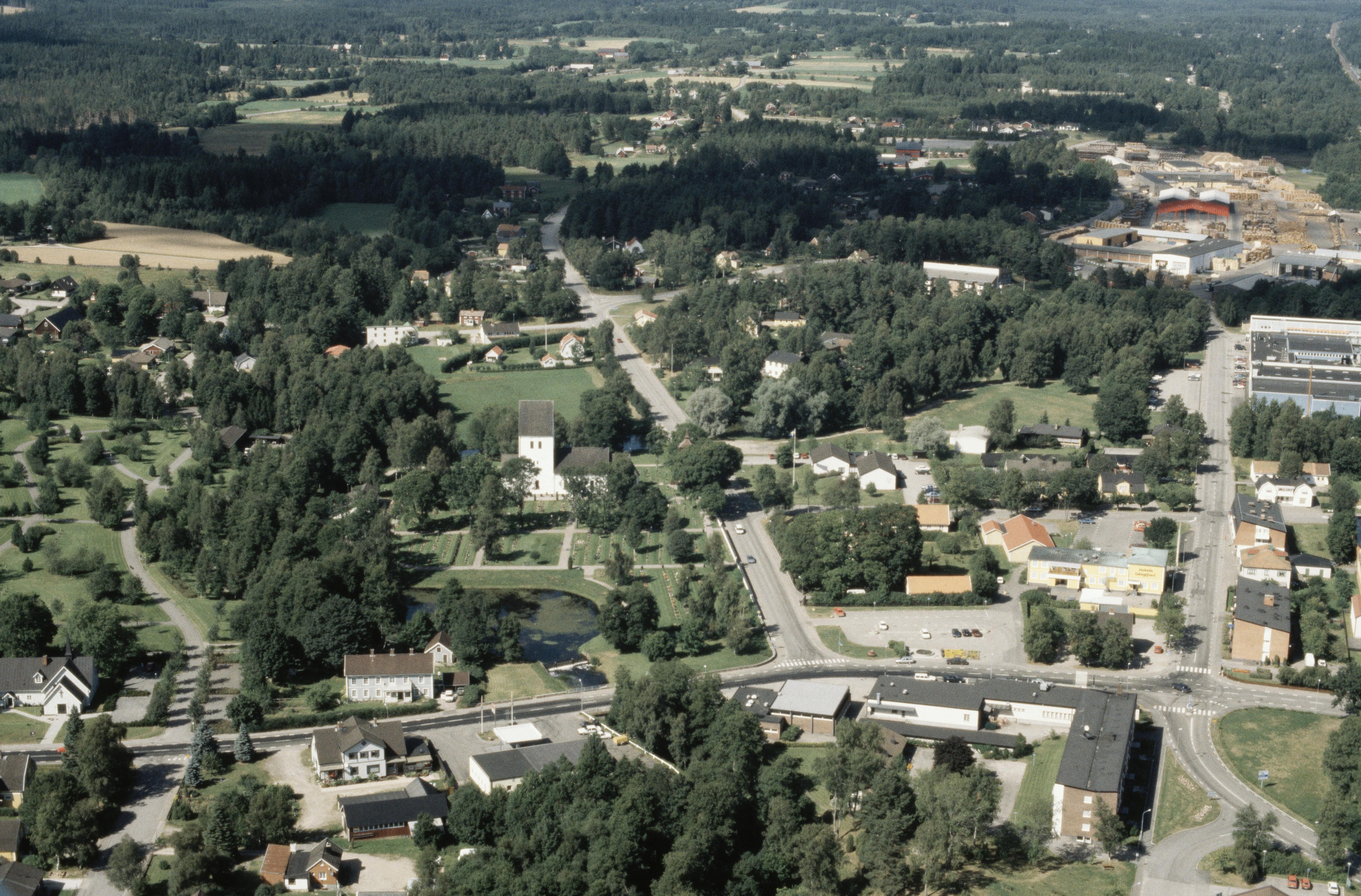 Beskrivning: Moheda tätort. Moheda kyrka vid bildens mitt. Bilden är tagen mot (väderstreck): NNV