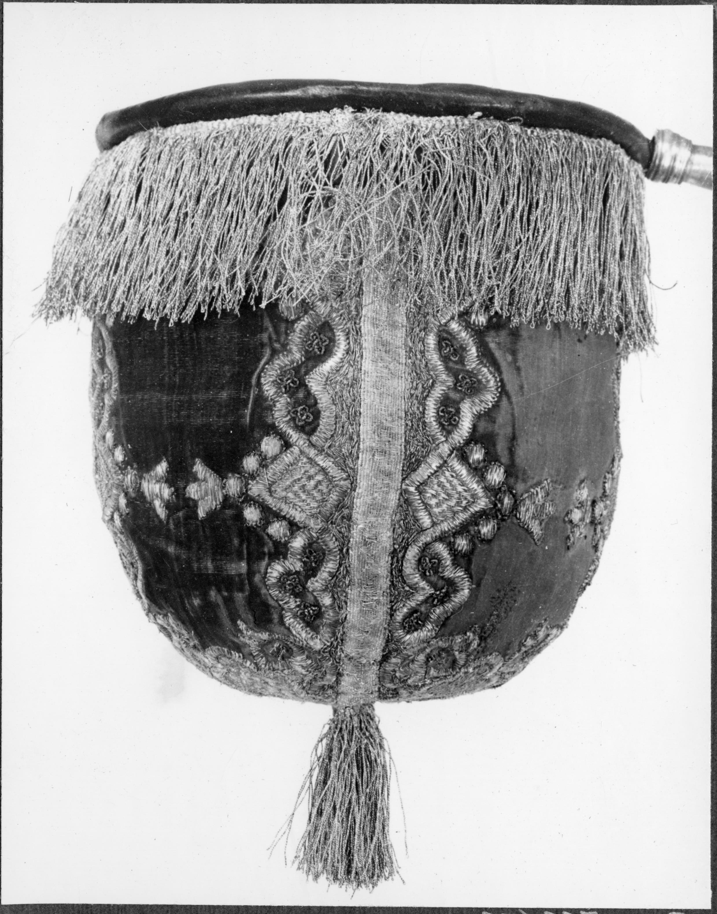 Beskrivning: Kollekthåv av svart sammet, broderier i silver och guld, 1700-talet.