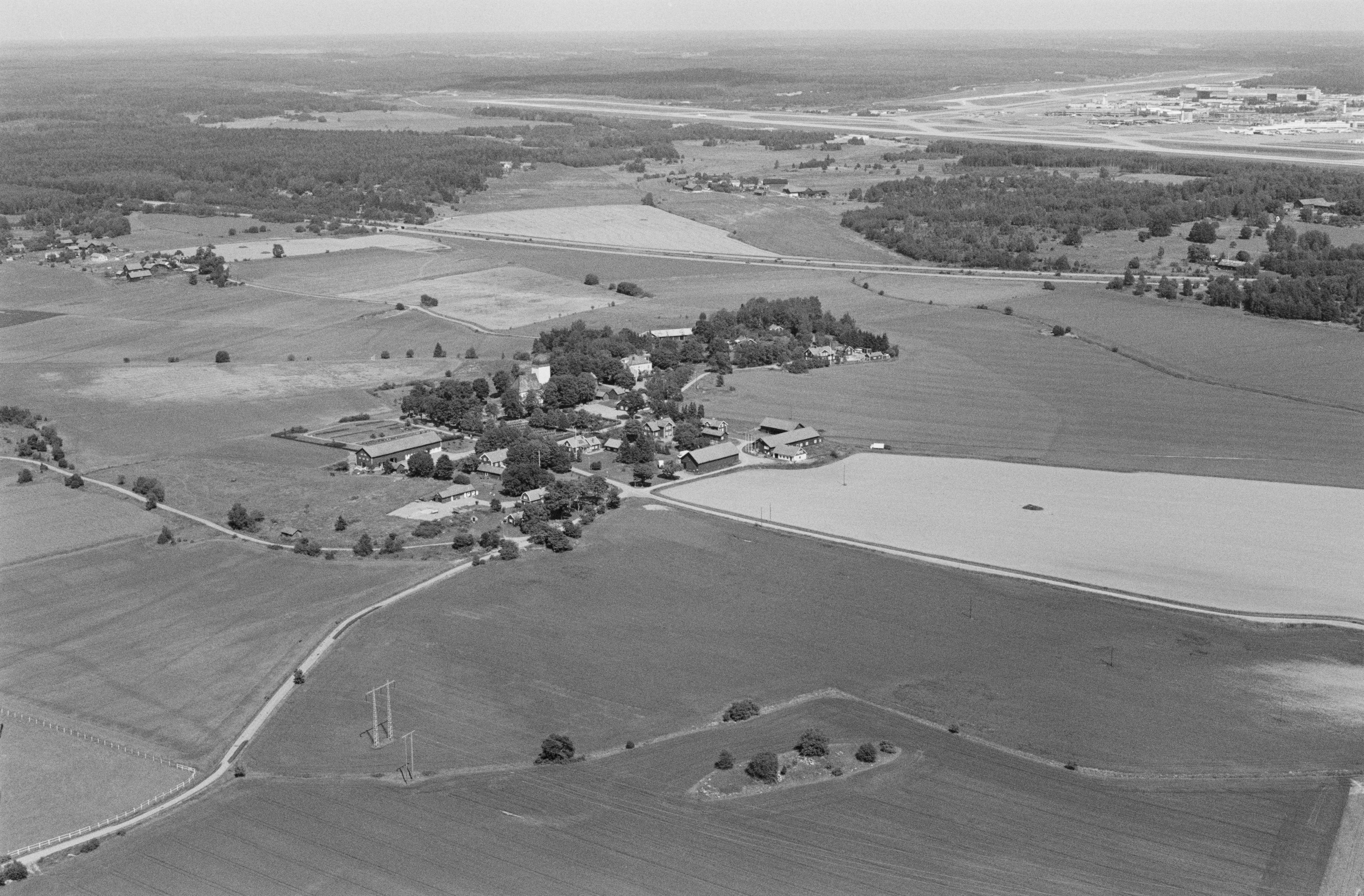 Beskrivning: Husby-Ärlinghundra kyrka i Husby kyrkby. Vid kyrkan gravfält RAÄnr Husby-Ärlinghundra 77:1. Uppe till höger Stockholms flygplats / Stockholm Arlanda Airport. Bilden är tagen mot (väderstreck): NO