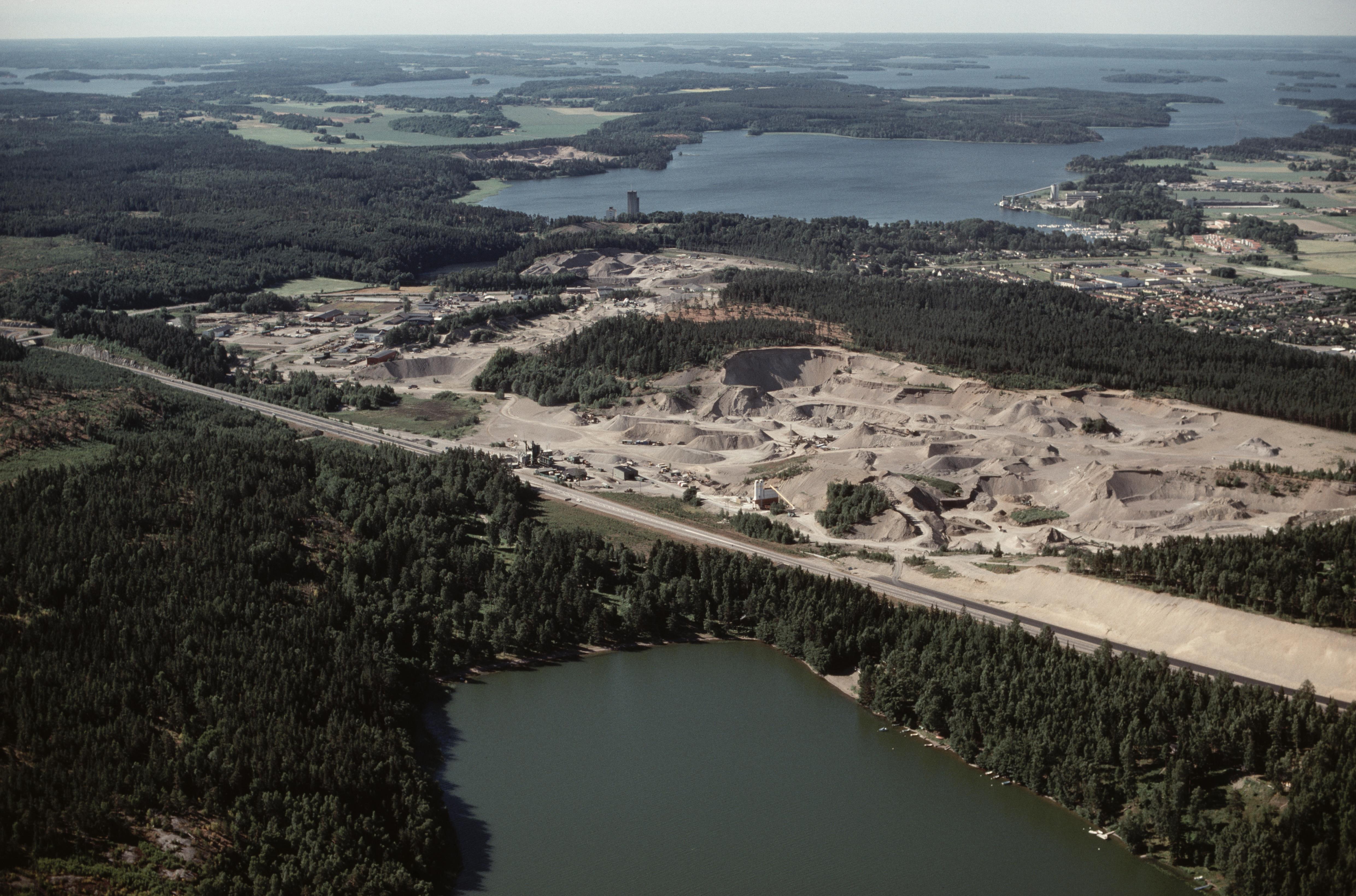 Beskrivning: I bildens nedre del Lilla Ullfjärden vid gränsen mellan socknen Håtuna, Kalmar och Yttergran. Vid bildens mitt grustäkt med fornborg ?Borgen? RAÄnr Håtuna 108:1. I bildens övre del Kalmarviken, Draget, Kalmarsand, Bålsta m.fl. Bilden är tagen mot (väderstreck): S