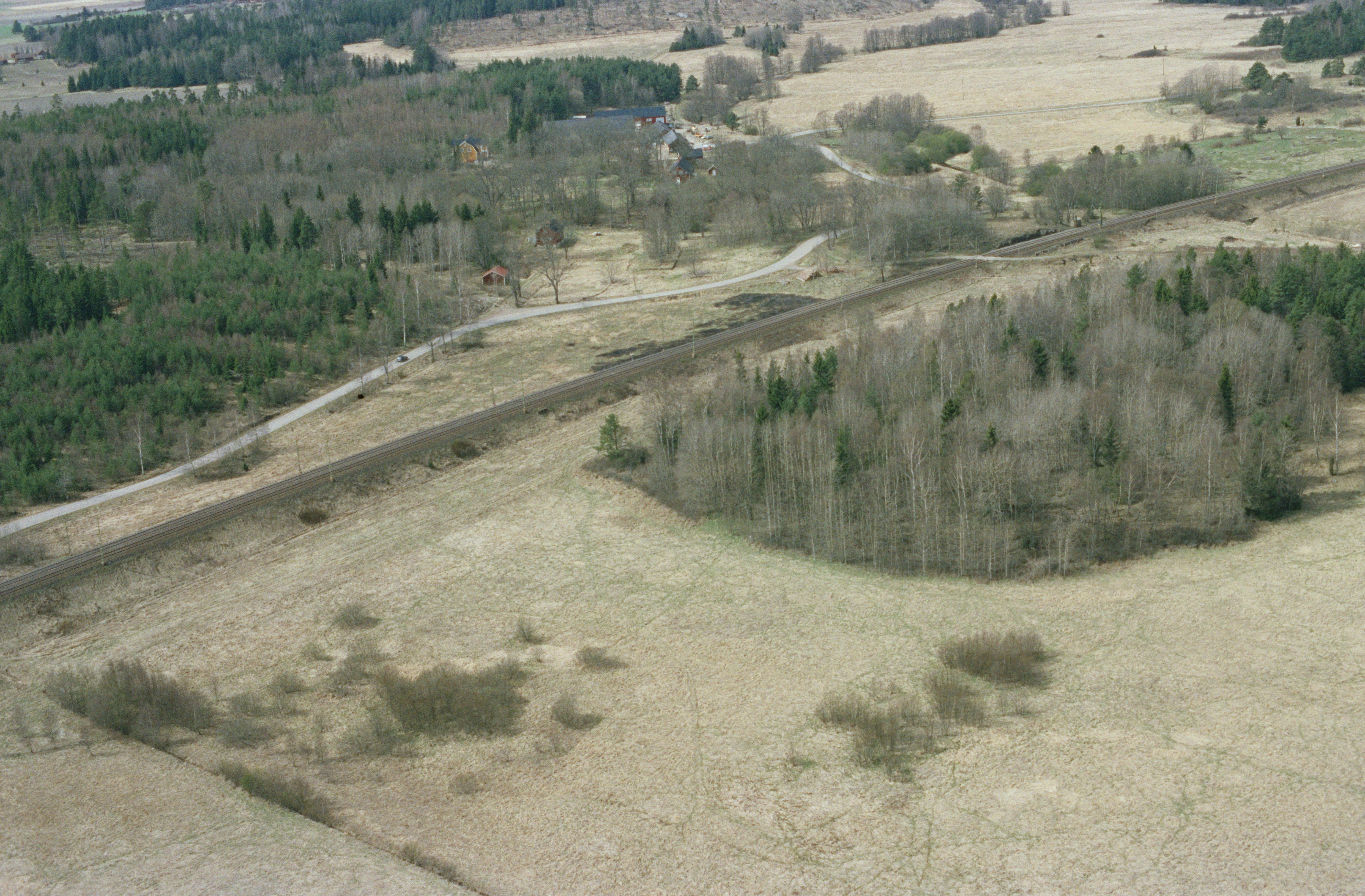 Beskrivning: Forsby i Forsbyåns dalgång. Vid bildens mitt husgrund RAÄnr Knivsta 176:1 och stensättning Knivsta 189:1. Uppe till höger gravfält RAÄnr Knivsta 126:1 med hällristningar Knivsta 269:1-9 m.fl. vid Grindstugan. Bilden är tagen mot (väderstreck): VSV