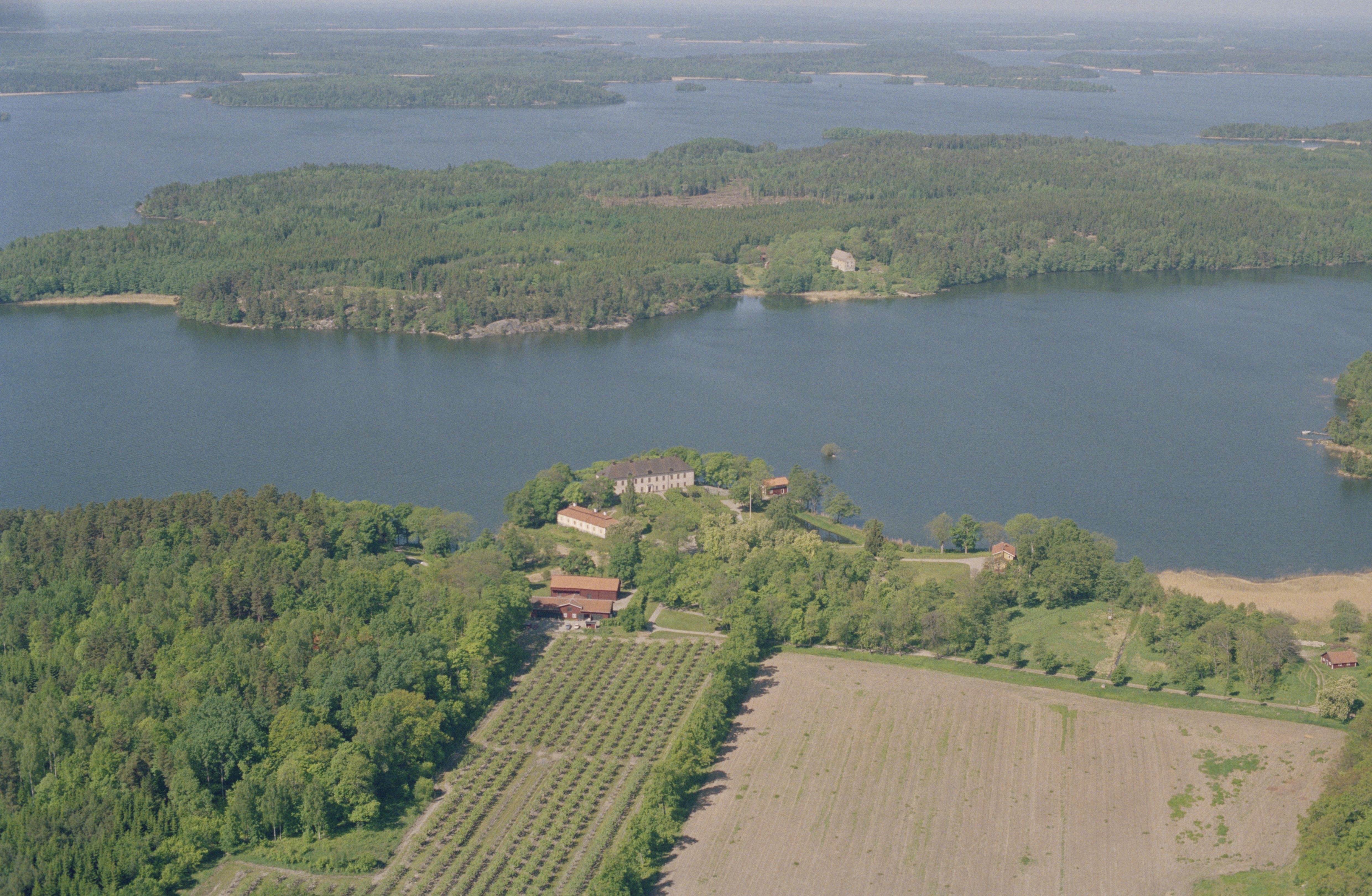 Beskrivning: Anmärkning (övrig): Riksintresse-nr/namn: C62 - Bond-Arnö och Grönsöö. Socken: Kungs-Husby och f.d. Arnö sn) Utredningsområde. Motivering: Småbrutet herrgårdslandskap av medeltida ursprung beläget i Mälaren med flera välbevarade gårdsbyggnader från medeltid och framåt. (Fornlämningsmiljö, Kyrkomiljö,Vägmiljö, Slottsmiljö). - Uttryck för riksintresset: På Arnö småbrutet odlingslandskap, yngre järnåldersgravfält, Arnöbergs herrgårdsmiljö med huvudbyggnad från 1700-talet, medeltida kyrka, ruin av Strandby medeltida sätesgård, prästgård, skola, torp och ålderdomligt vägnät samt Utö hus från 1400-talet, ett av landets mest välbevarade medeltida herresäten. På Grönsö: yngre järnåldersgravfält, torp, den ovanligt välbevarade slottsanläggningen Grönsöö med huvudbyggnad från 1600-talet, park- och trädgårdsanläggning. [Texten uppdaterat av Riksantikvarieämbetet våren 2013.] Beskrivning: Grönsö slott (äldre stavning Grönsöö slott), byggnadsminne RAÄnr Kungs-Husby 89:1, vid Grönsösundet i Mälaren. I bildens övre del statligt byggnadsminne Utö hus RAÄnr Kungs-Husby 70:1 på Arnö. Bilden är tagen mot (väderstreck): V Fotosyfte: Flygbildsdokumentation