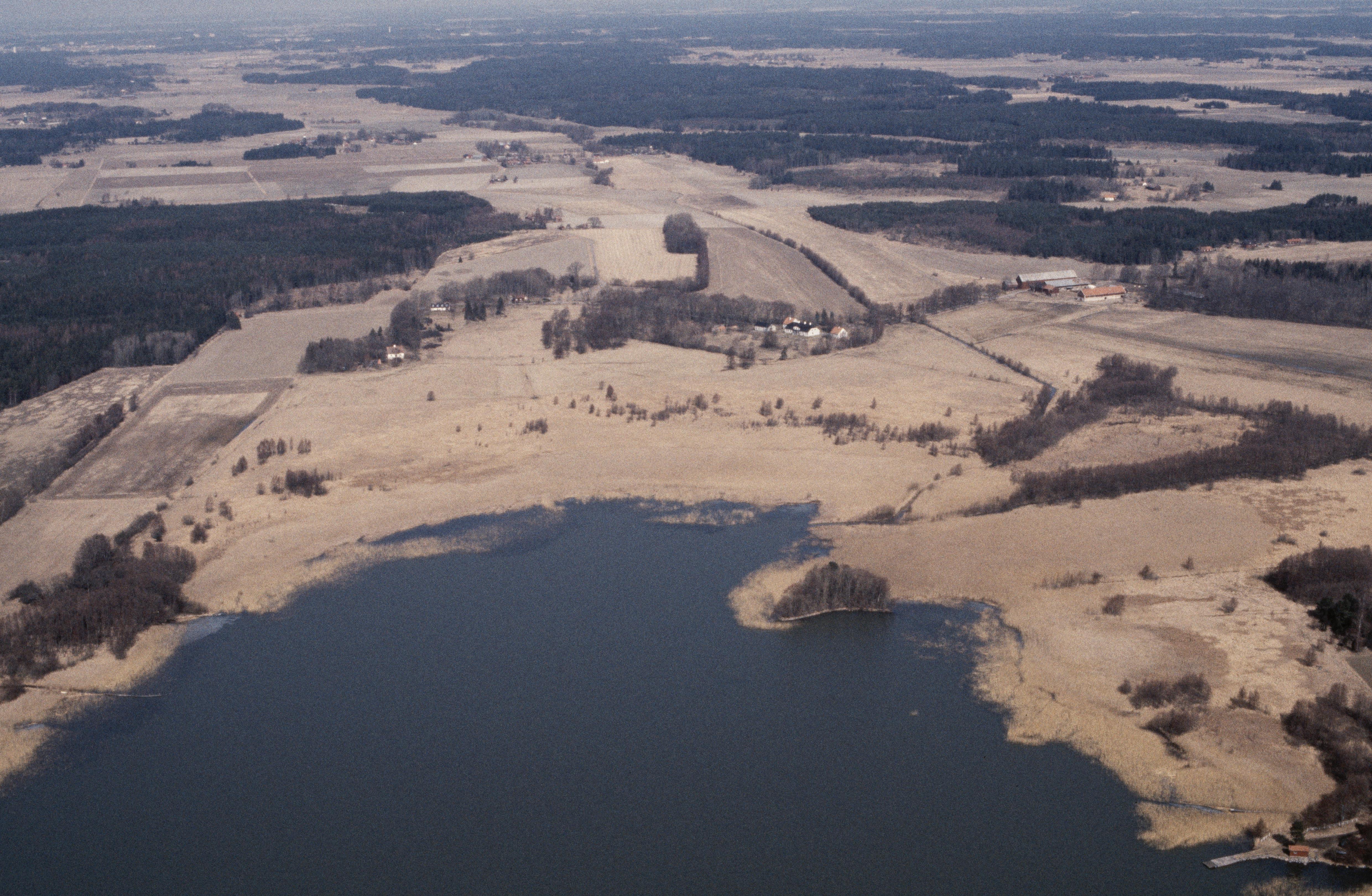 Beskrivning: Norra delen av sjön Ekaviken och Ekaåns dalgång. Eka herrgård vid bildens mitt. I bildens övre del socknen Vallby och Boglösa. Bilden är tagen mot (väderstreck): NV