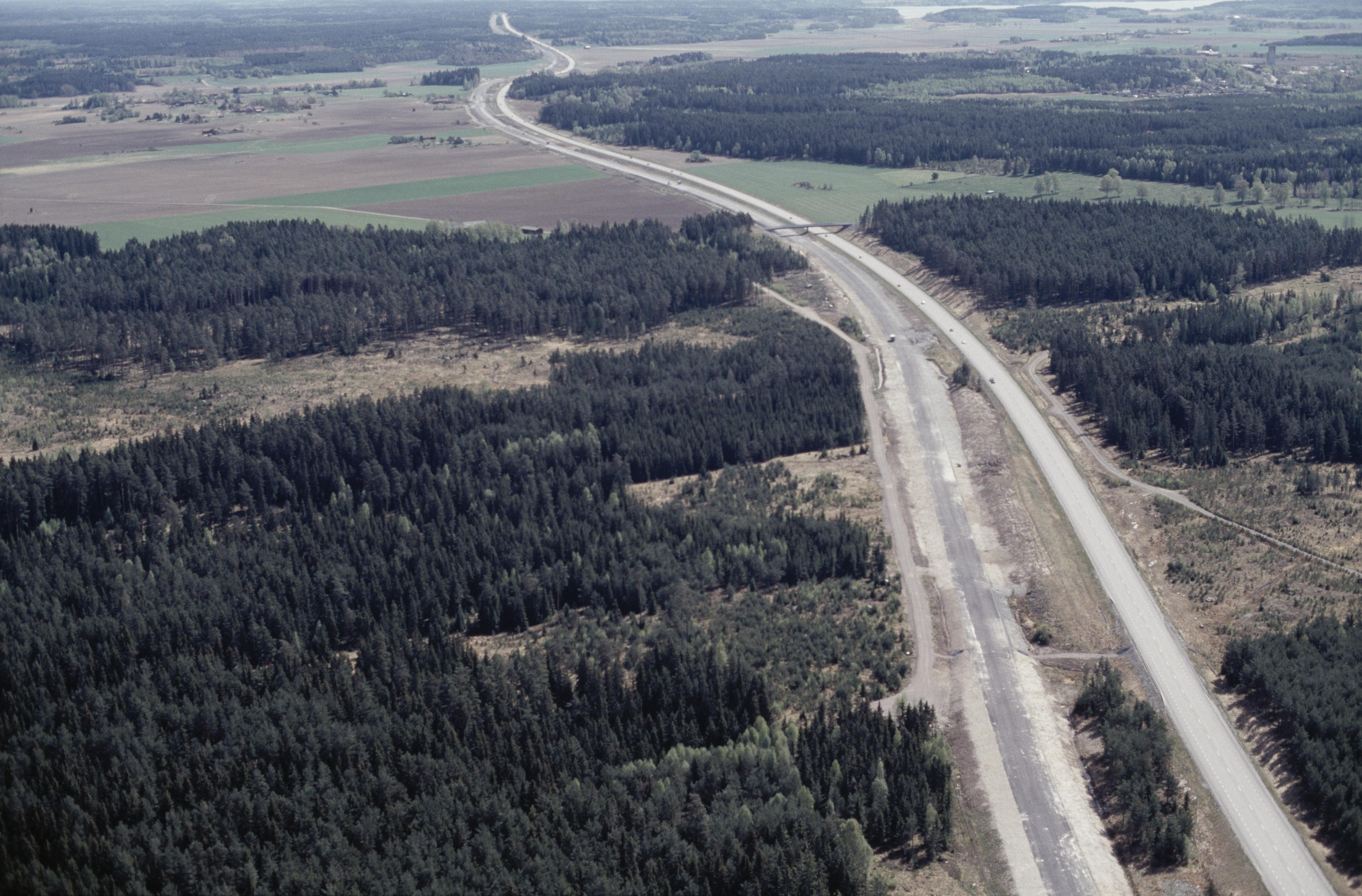 Beskrivning: Arkeologiska undersökningar i samband med bygge av väg E18 genom fornlämningsområden söder om Tibble. I bildens övre del Fiskvik, Knoppbacka och Skäggesta med bl.a. grav- och boplats RAÄnr Litslena 561:1-3. Bilden är tagen mot (väderstreck): OSO