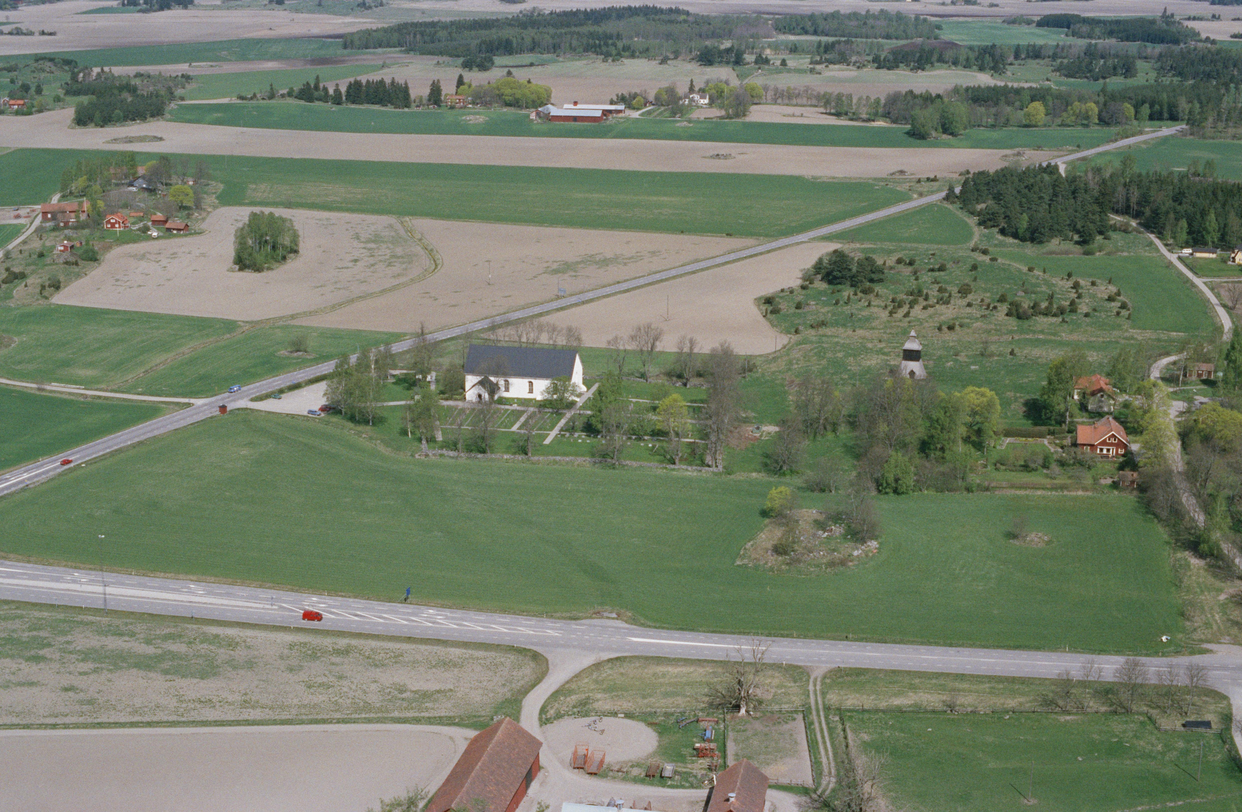 Beskrivning: Litslena kyrka och kyrkby. Uppe till vänster fornlämningsområdet Blomsterbacken med hällristningar och högar, bl.a. RAÄnr Litslena 149:1-2, 423:1-3. Bilden är tagen mot (väderstreck): NV