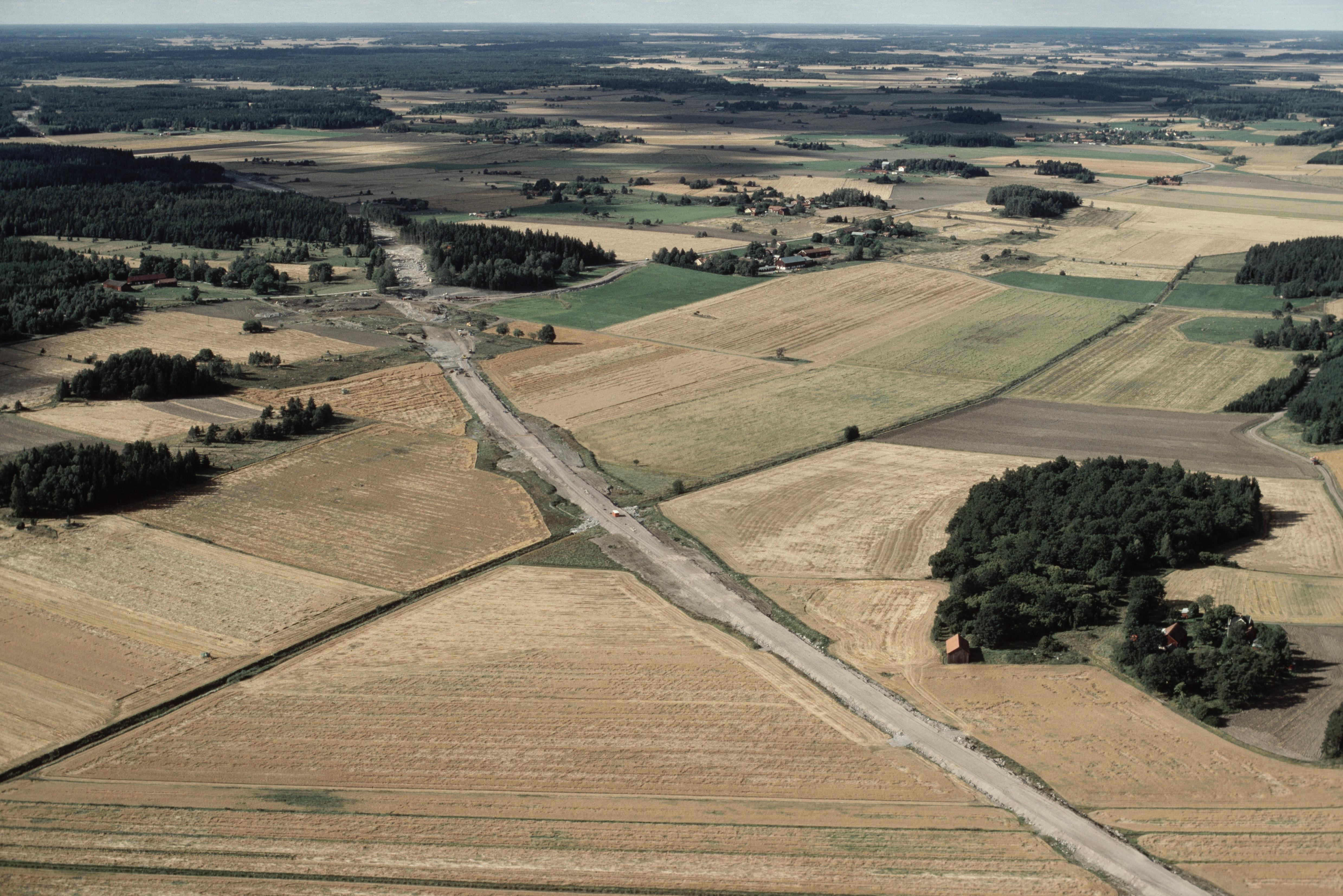 Beskrivning: Arkeologisk undersökning i samband med bygge av väg E18 vid Skäggesta. I bildens övre del Knoppbacka, Fiskvik och Tibble m.m. Till vänster om bildens mitt boplats med hägnad RAÄnr Litslena 485:1-2. I bildens nedre del gränsen mot Villberga socken längs Fiskviks kanal. Bilden är tagen mot (väderstreck): NV