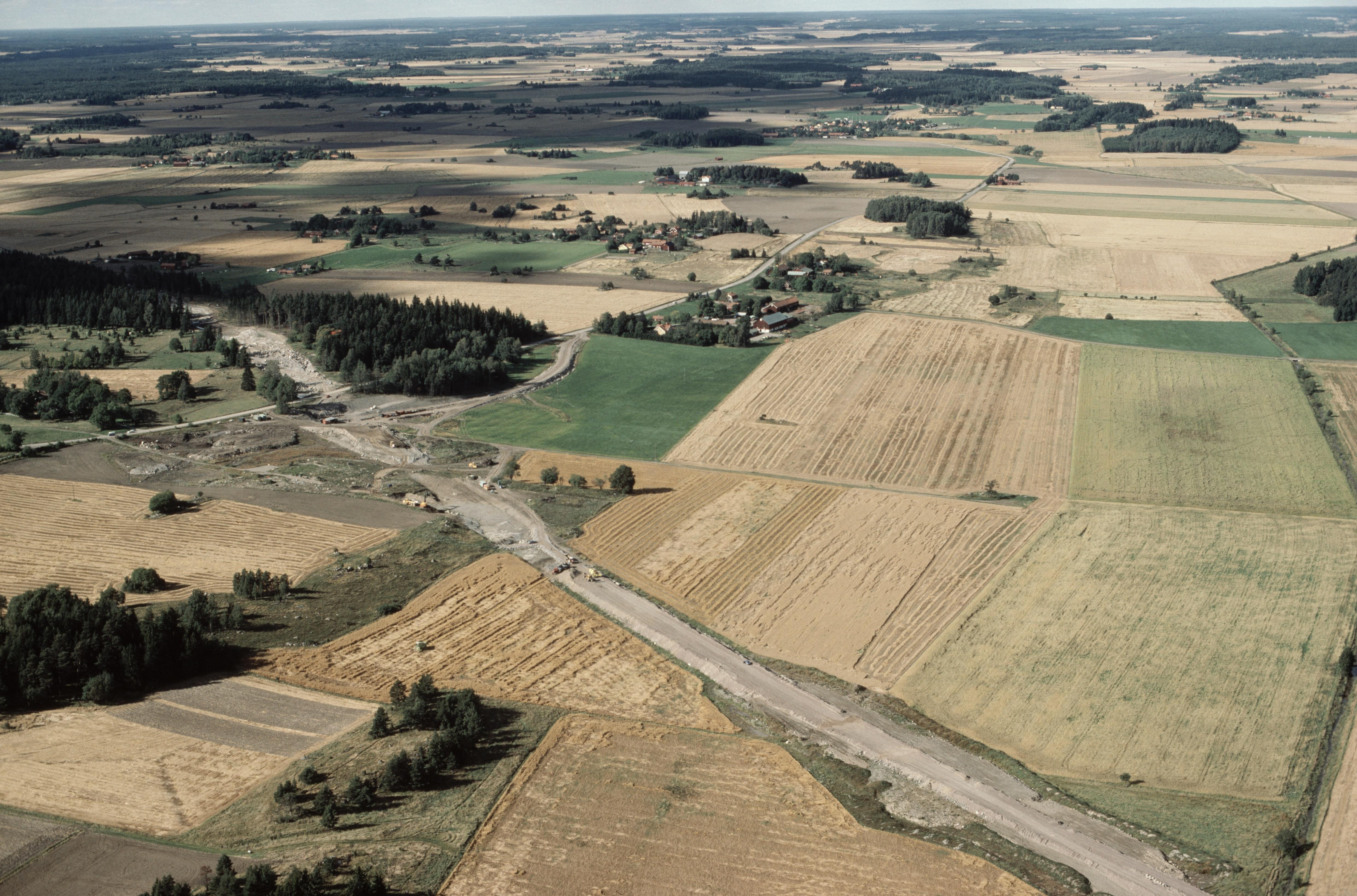 Beskrivning: Beskrivning: Arkeologisk undersökning i samband med bygge av väg E18 vid Skäggesta. I bildens övre del Knoppbacka, Fiskvik och Tibble m.m. Till vänster om bildens mitt boplats med hägnad RAÄnr Litslena 485:1-2. I bildens högra del Fiskviks kanal. Bilden är tagen mot (väderstreck): NNV Fotosyfte: Flygbildsdokumentation
