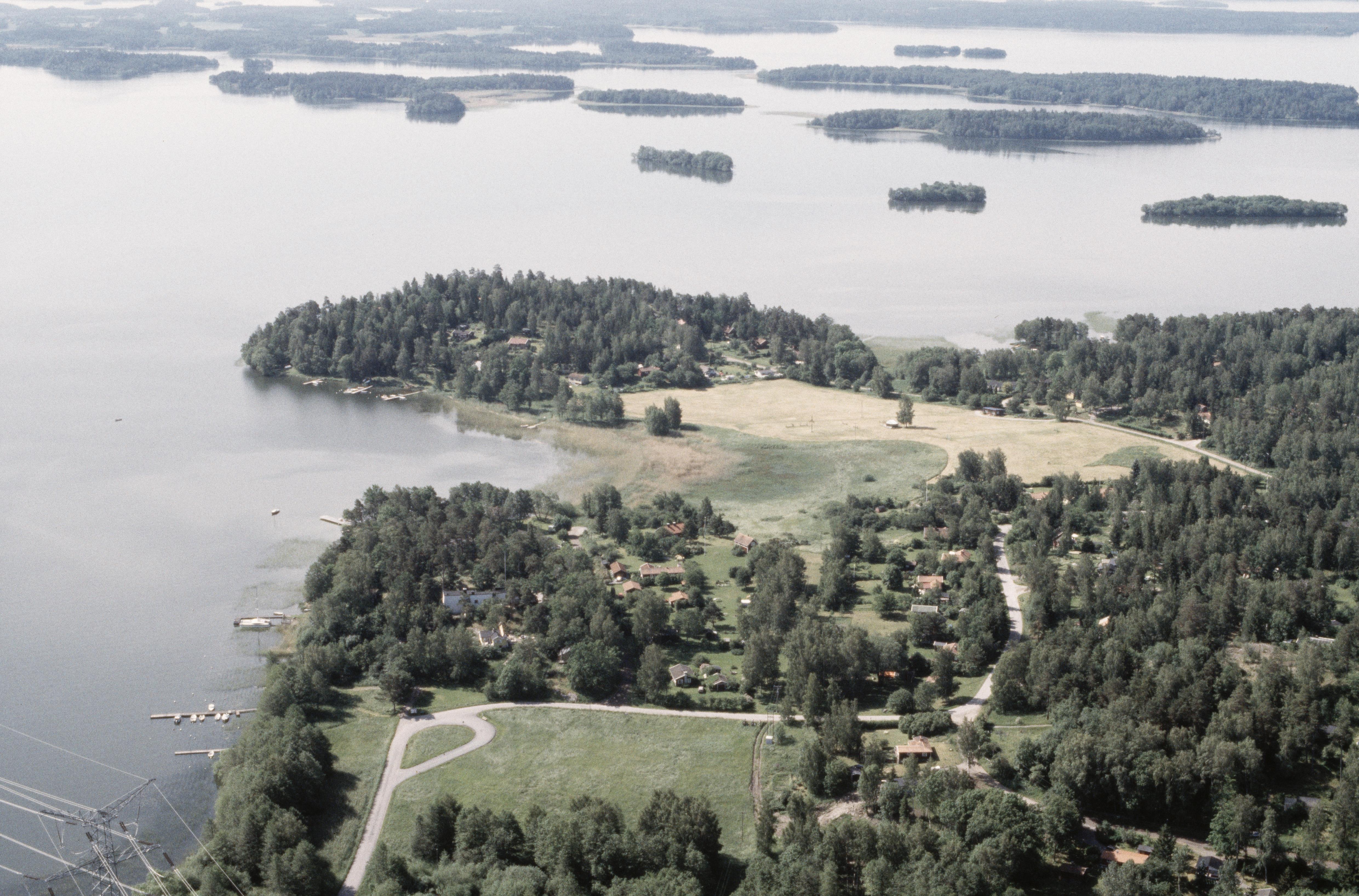 Beskrivning: Smidö tätort vid Smidöfjärden i Mälaren. Bryggudden vid bildens mitt. I bildens övre del sydöstra delen av Norra Björkfjärdens naturreservat. Bilden är tagen mot (väderstreck): S