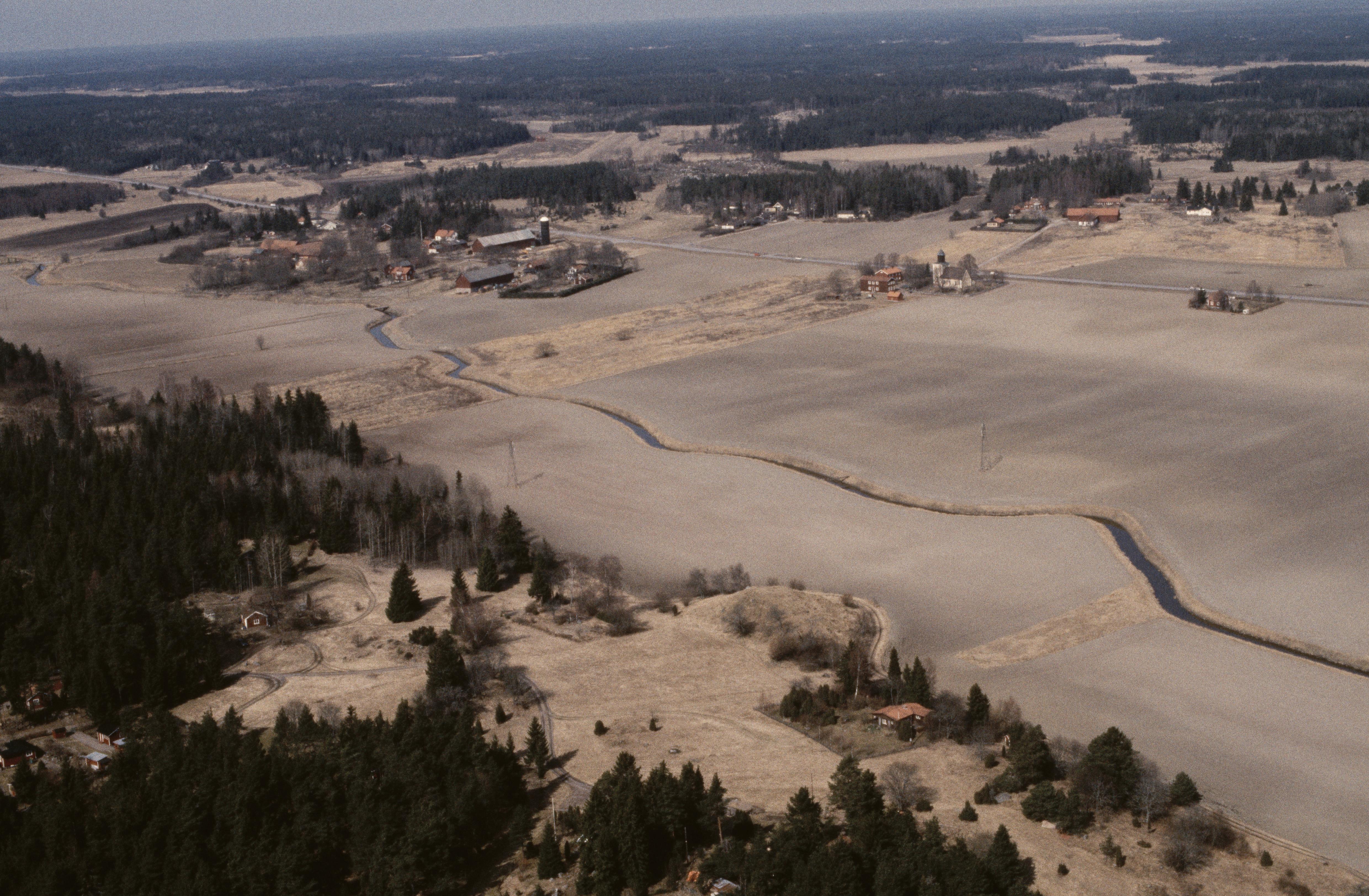 Beskrivning: Hågaåns dalgång vid Västerby och Läby kyrka. I bildens nedre del Vadbackahögen / Läby vad RAÄnr Läby 18:1. Bilden är tagen mot (väderstreck): NV