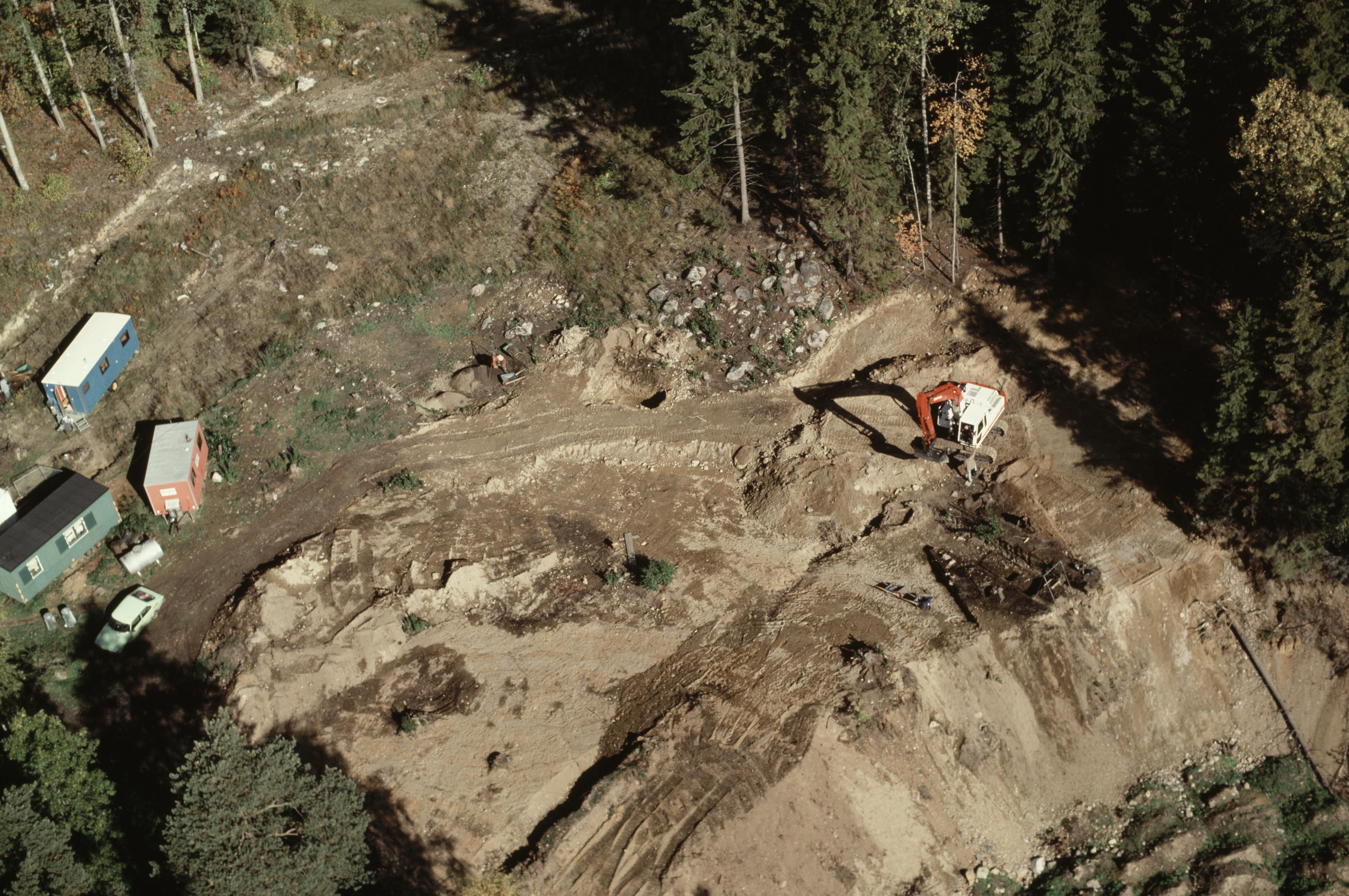 Beskrivning: Arkeologisk undersökning innan järnvägen Grödingebanan byggs. Vid bildens mitt boplats RAÄnr Grödinge 477:1 och bytomt Grödinge 530:1 m.fl. vid golfbanan och Malmbro gård. Bilden är tagen mot (väderstreck): NNV