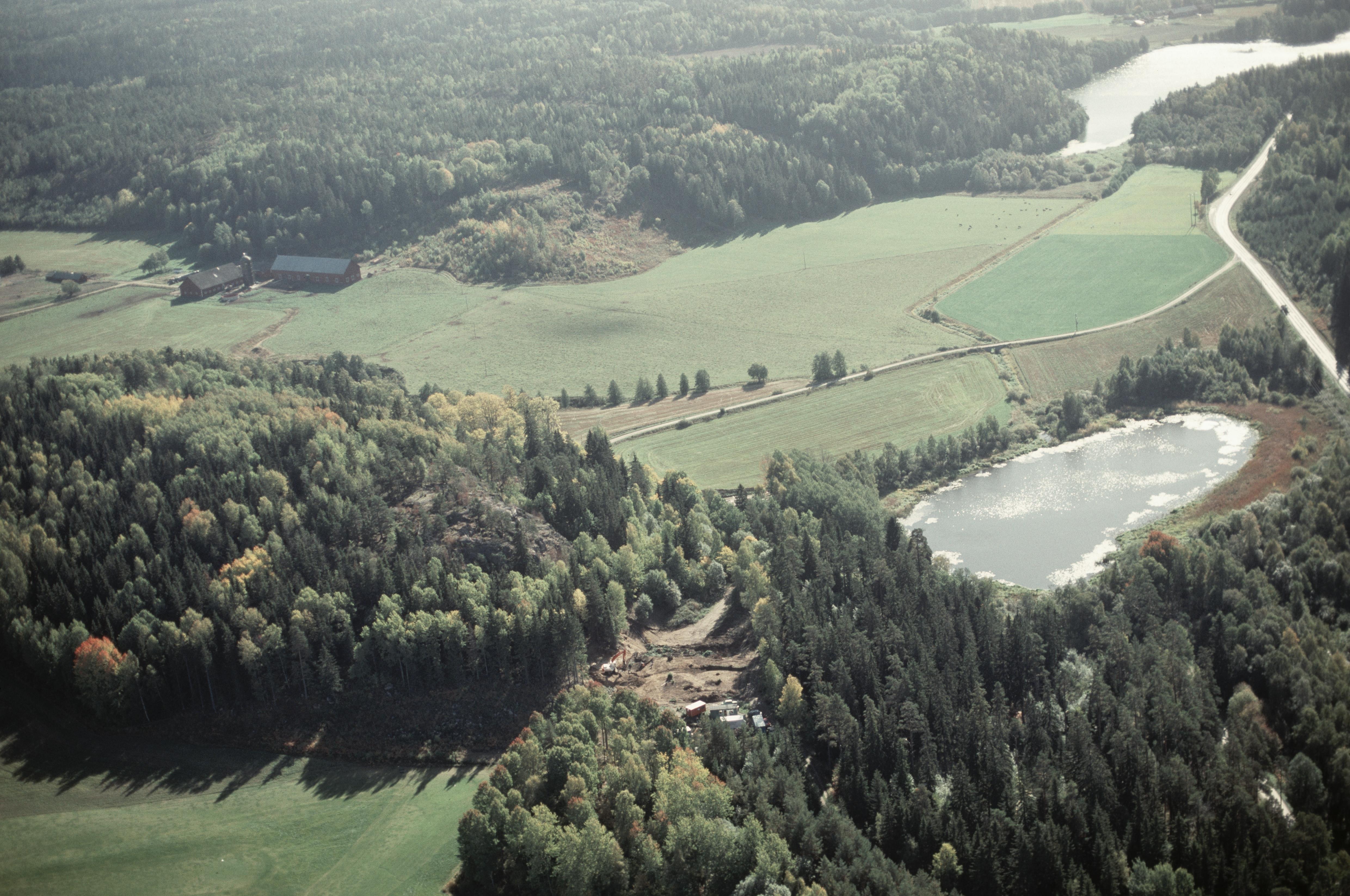 Beskrivning: Arkeologisk undersökning innan järnvägen Grödingebanan byggs. Vid bildens mitt boplats RAÄnr Grödinge 477:1, bytomt Grödinge 530:1 vid sjön Gölan öster om Malmbro gård. I bildens övre del till vänster Nolinge gård och till höger sjön Axaren. Bilden är tagen mot (väderstreck): S