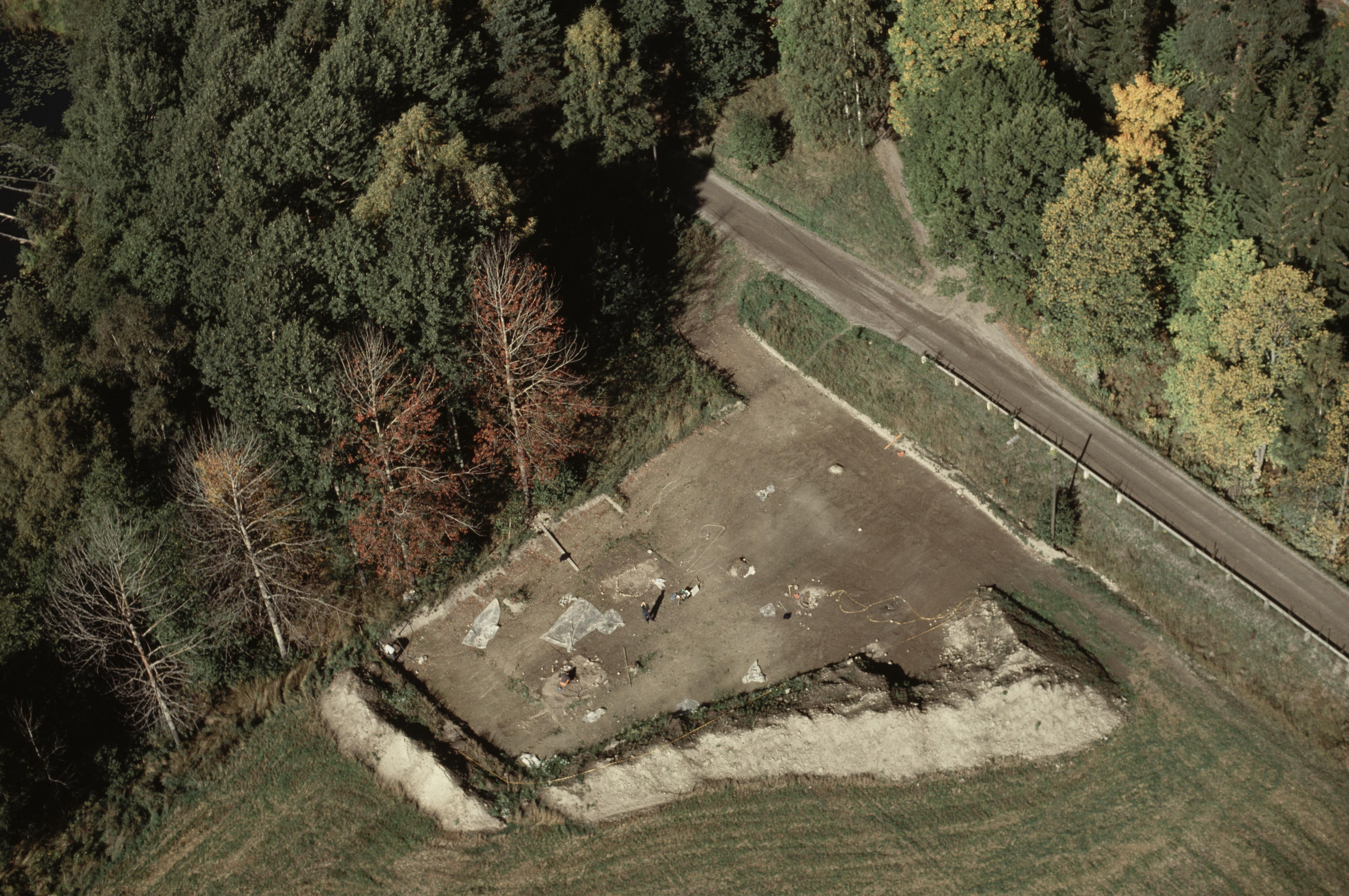Beskrivning: Arkeologisk undersökning innan järnvägen Grödingebanan byggs. Gravfält RAÄnr Grödinge 236:1-4 vid sjön Gölan, sydväst om Malmbro gård. Bilden är tagen mot (väderstreck): NV
