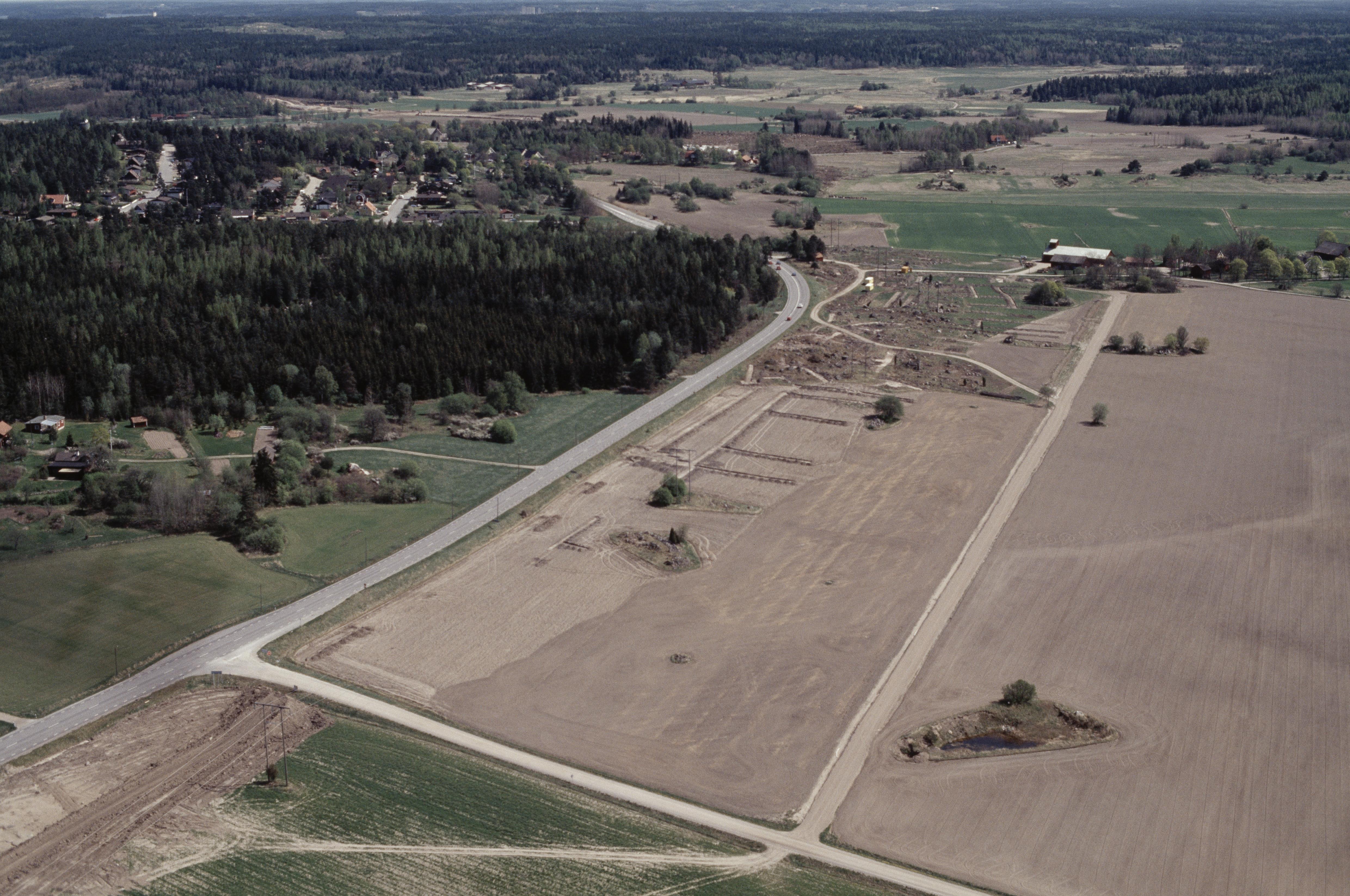 Beskrivning: Arkeologiska undersökningar innan vägbygge av E3 / E20 i området söder om Sörfjärden i Mälaren. Grav- och boplats RAÄnr Härad 72:1, 82:1 m.fl. vid Kumla by. Bilden är tagen mot (väderstreck): NO