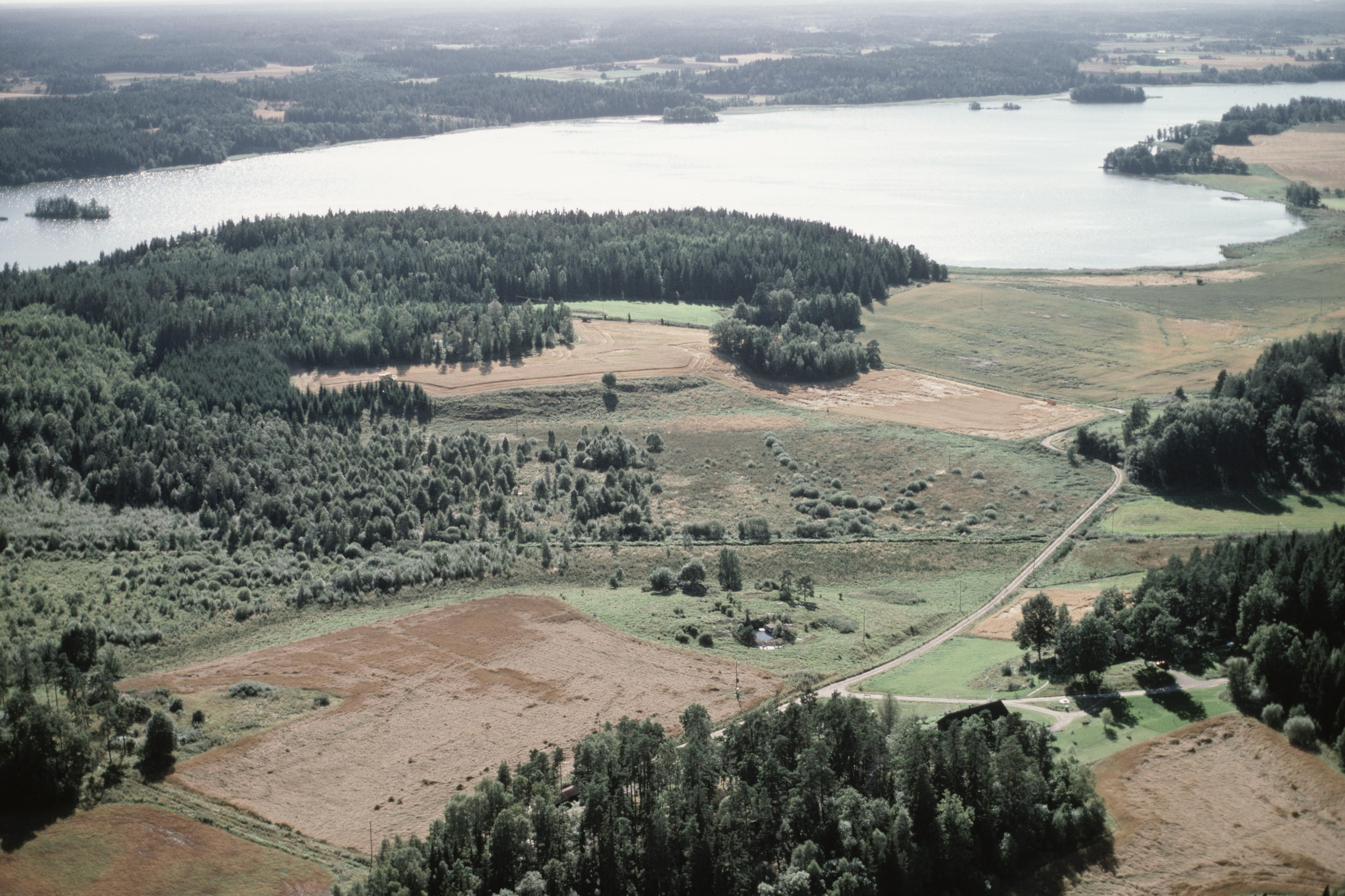 Beskrivning: Sydväst om Norrtuna herrgård. Vid bildens mitt hällristningar RAÄnr Kattnäs 47:1, 70, 80 och bytomt Kattnäs 74:1 vid Kalkbergets gamla kalkbrott. I bildens övre del Storsjön. Bilden är tagen mot (väderstreck): OSO