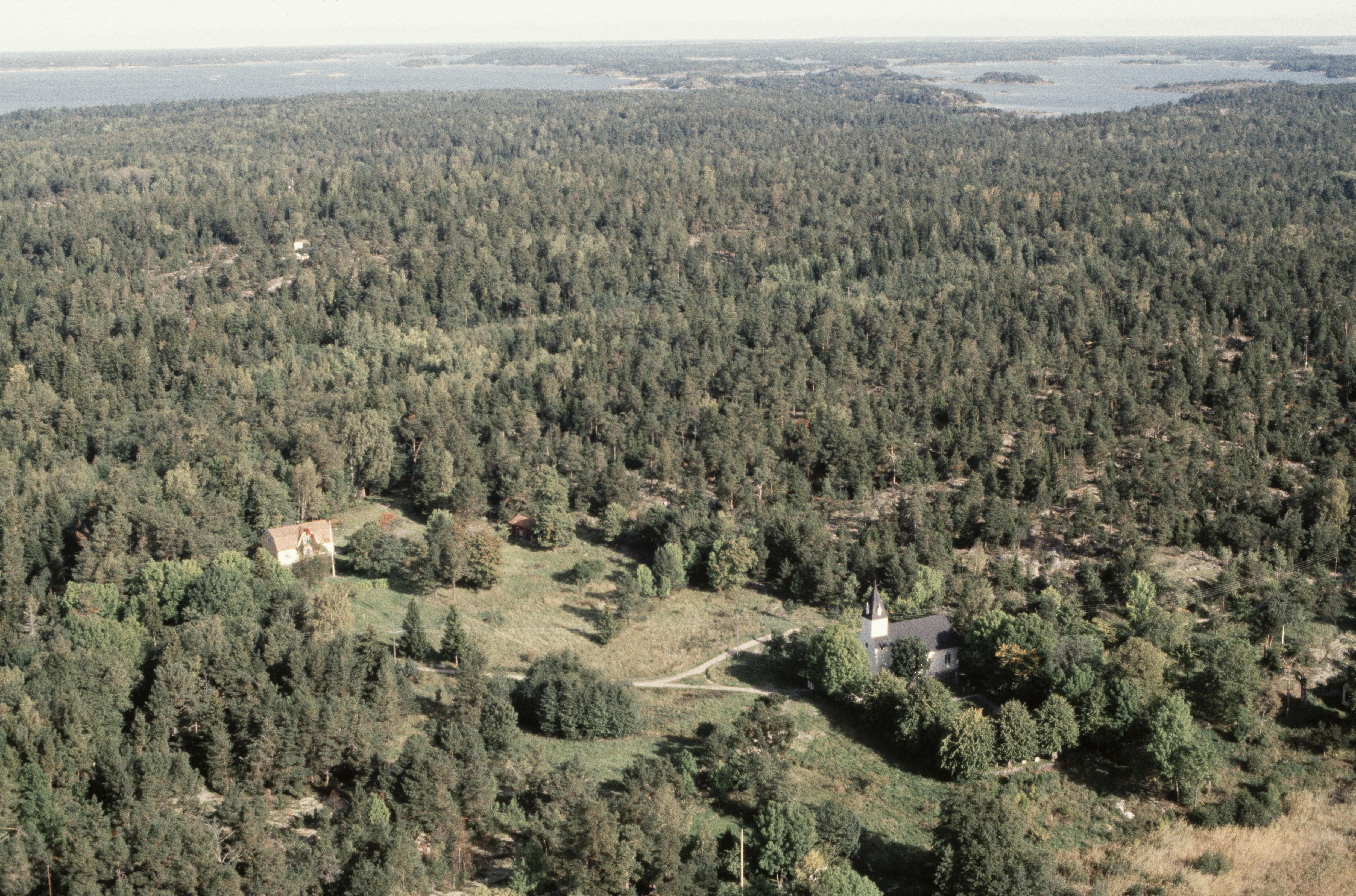 Beskrivning: Ön Nämdö, sydvästra delen. Nämdö kyrka och prästgård vid Orröströmmen i Nämdöfjärden. Bilden är tagen mot (väderstreck): NNO