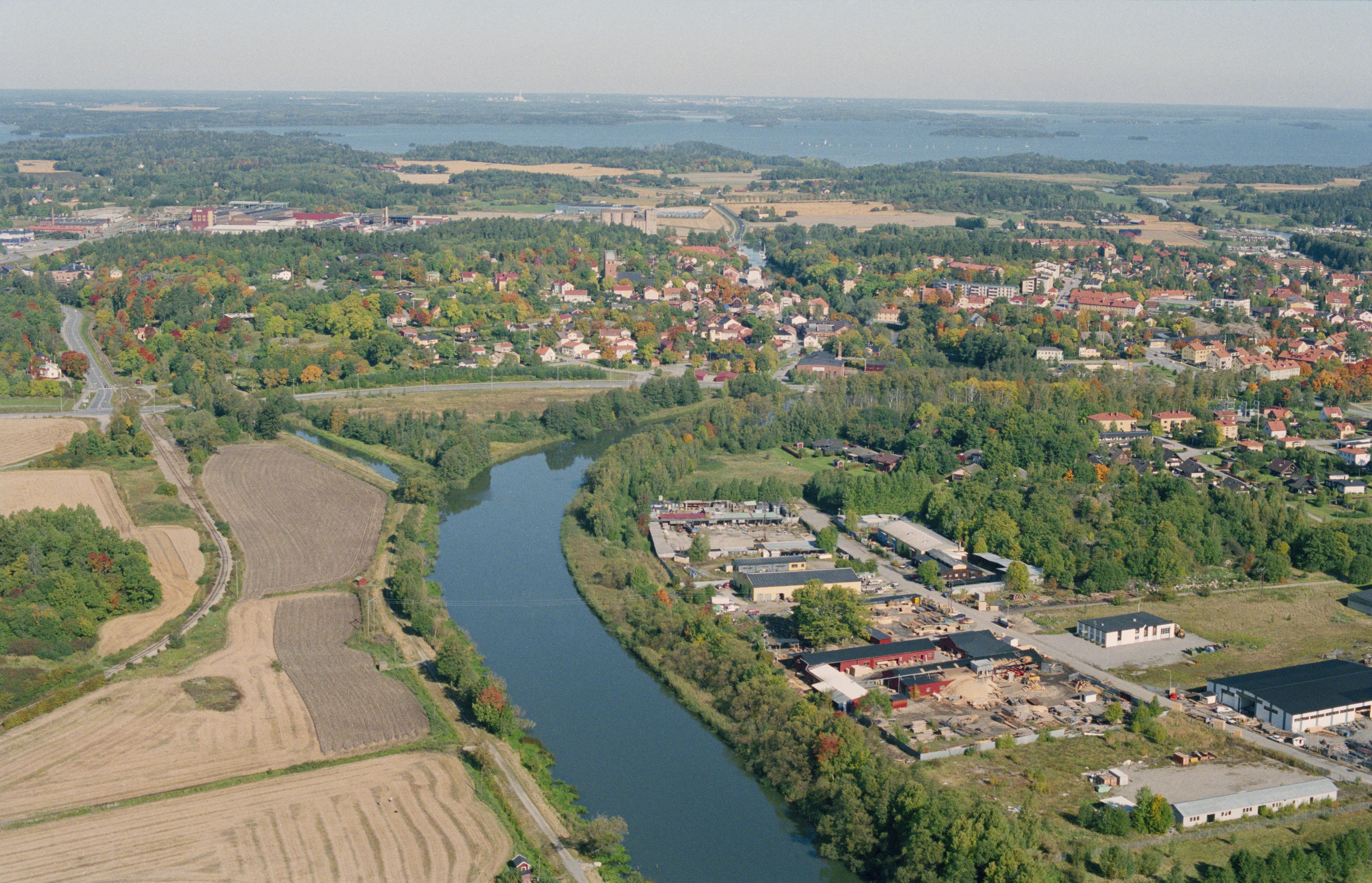 Beskrivning: Torshälla tätort. Nybyån och Eskilstunaån möts. Torshälla kyrka över bildens mitt. Mälaren i bildens övre del. Bilden är tagen mot (väderstreck): NNO