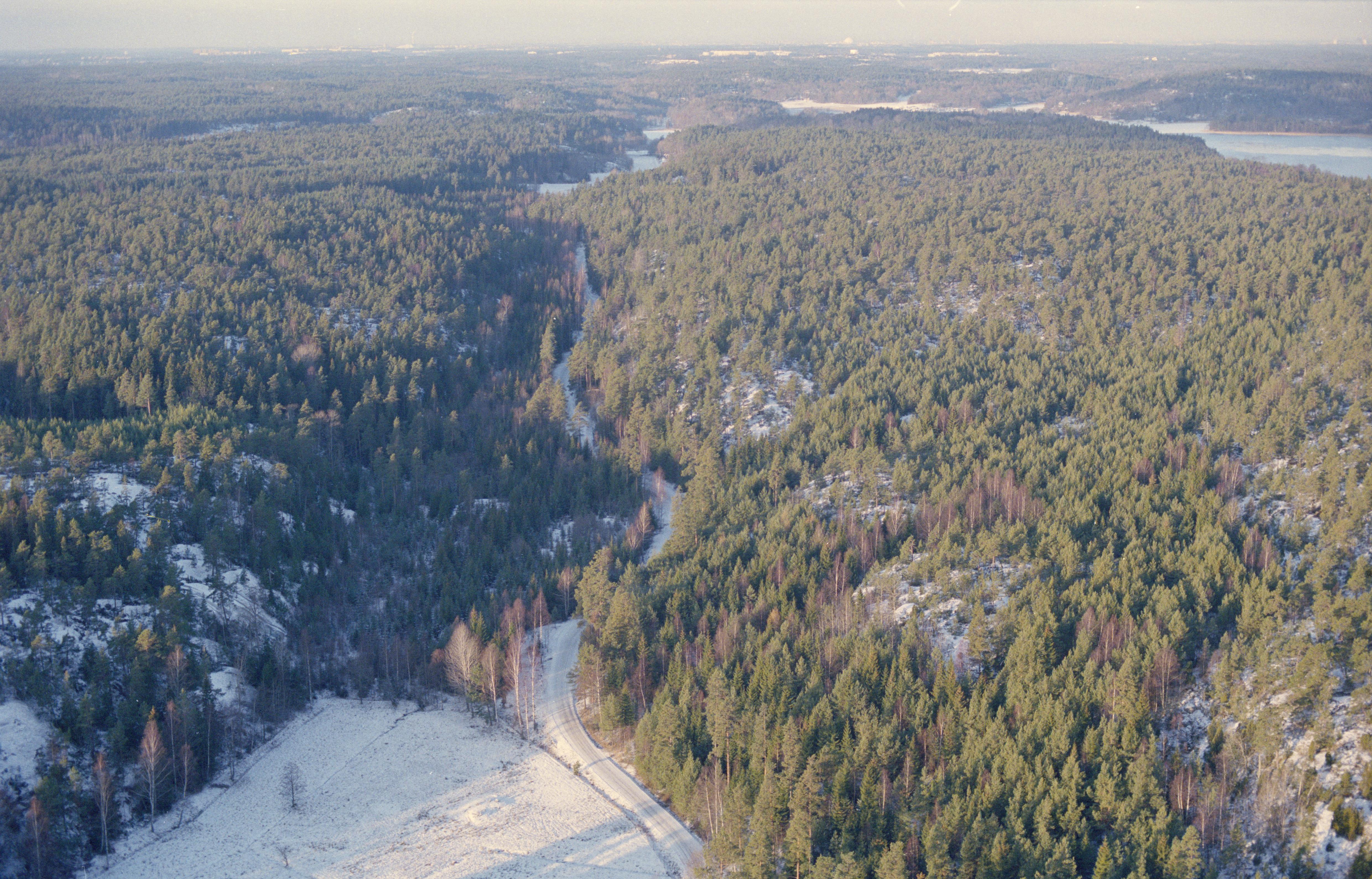 Beskrivning: Vissvassdalen norrväst om Vissvass by i Tyresta naturreservat. Till vänster om bildens mitt boplats Tyresö 131:1. I bildens övre del Mörkdalen. Bilden är tagen mot (väderstreck): NV