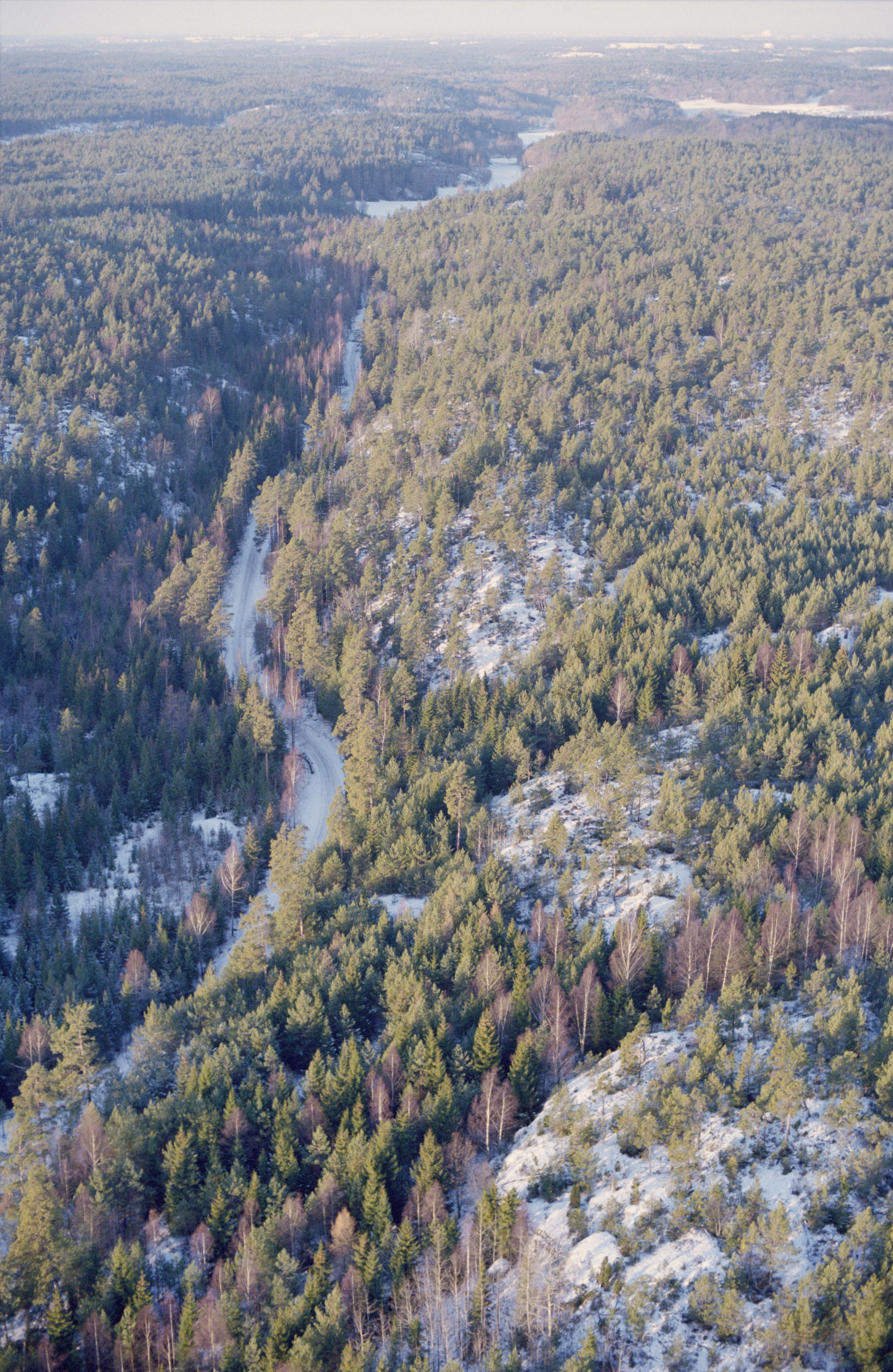 Beskrivning: Vissvassdalen norrväst om Vissvass by i Tyresta naturreservat. Till vänster om bildens mitt boplats Tyresö 131:1. I bildens övre del Mörkdalen. Bilden är tagen mot (väderstreck): NV