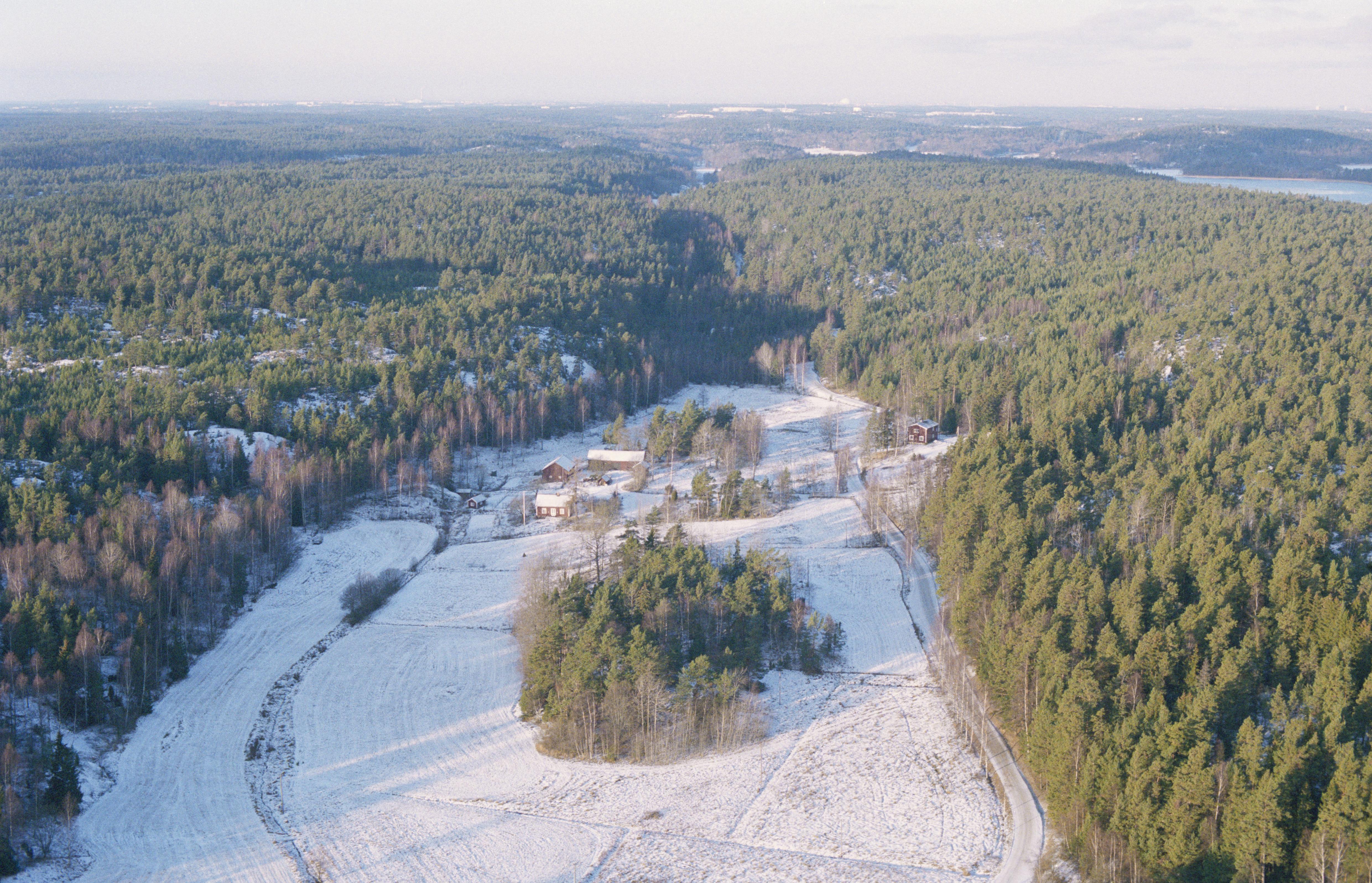 Beskrivning: Tyresta naturrreservat. Norrgården norrväst i Vissvass by vid bildens mitt. I bildens övre del Vissvassdalen mot Mörkdalen. Bilden är tagen mot (väderstreck): VNV