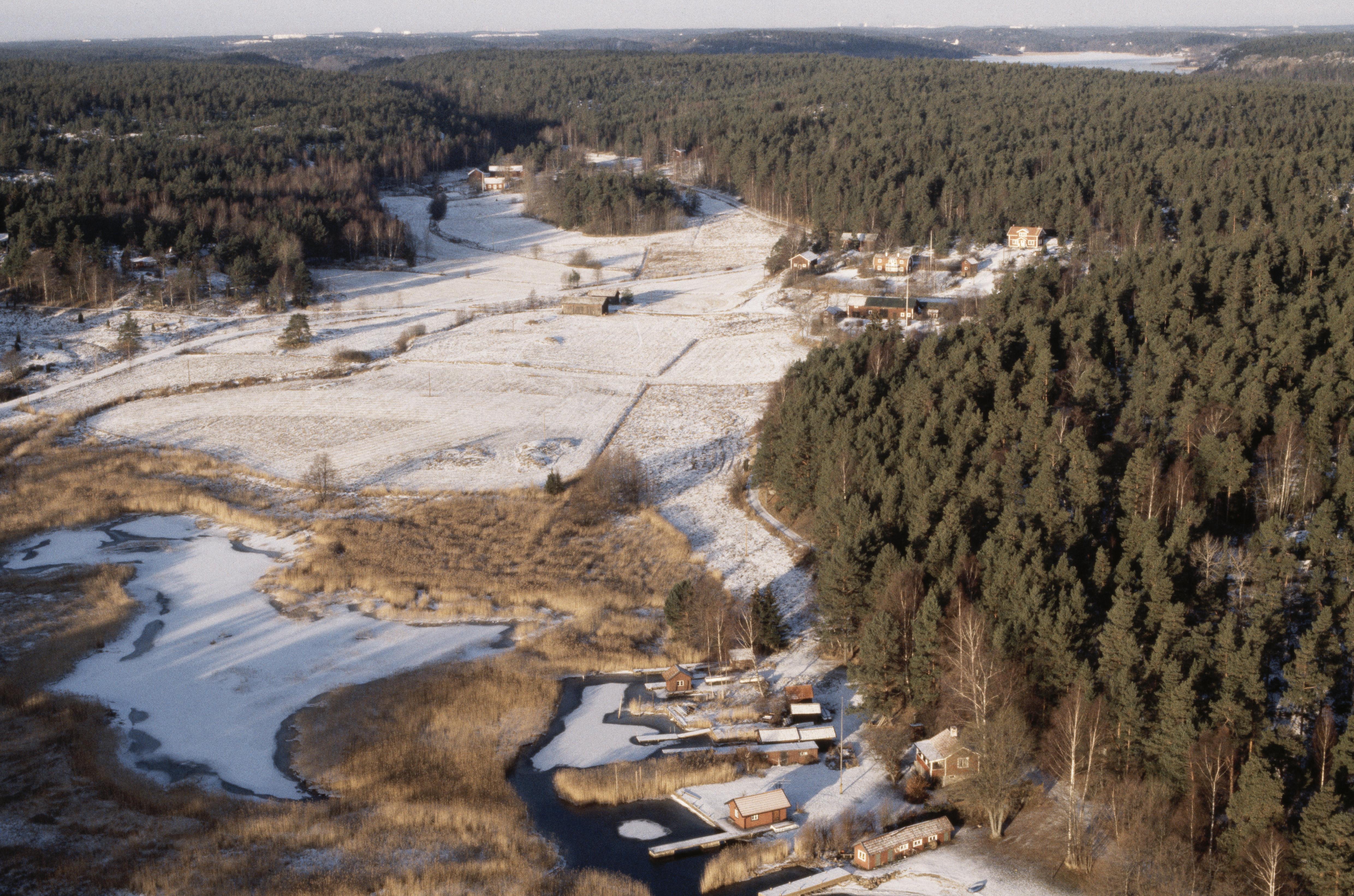 Beskrivning: Tyresta naturrreservat. Vissvass by vid Vissvassfjärden. I bildens övre del Norrgården och Vissvassdalen mot Mörkdalen. Bilden är tagen mot (väderstreck): NV
