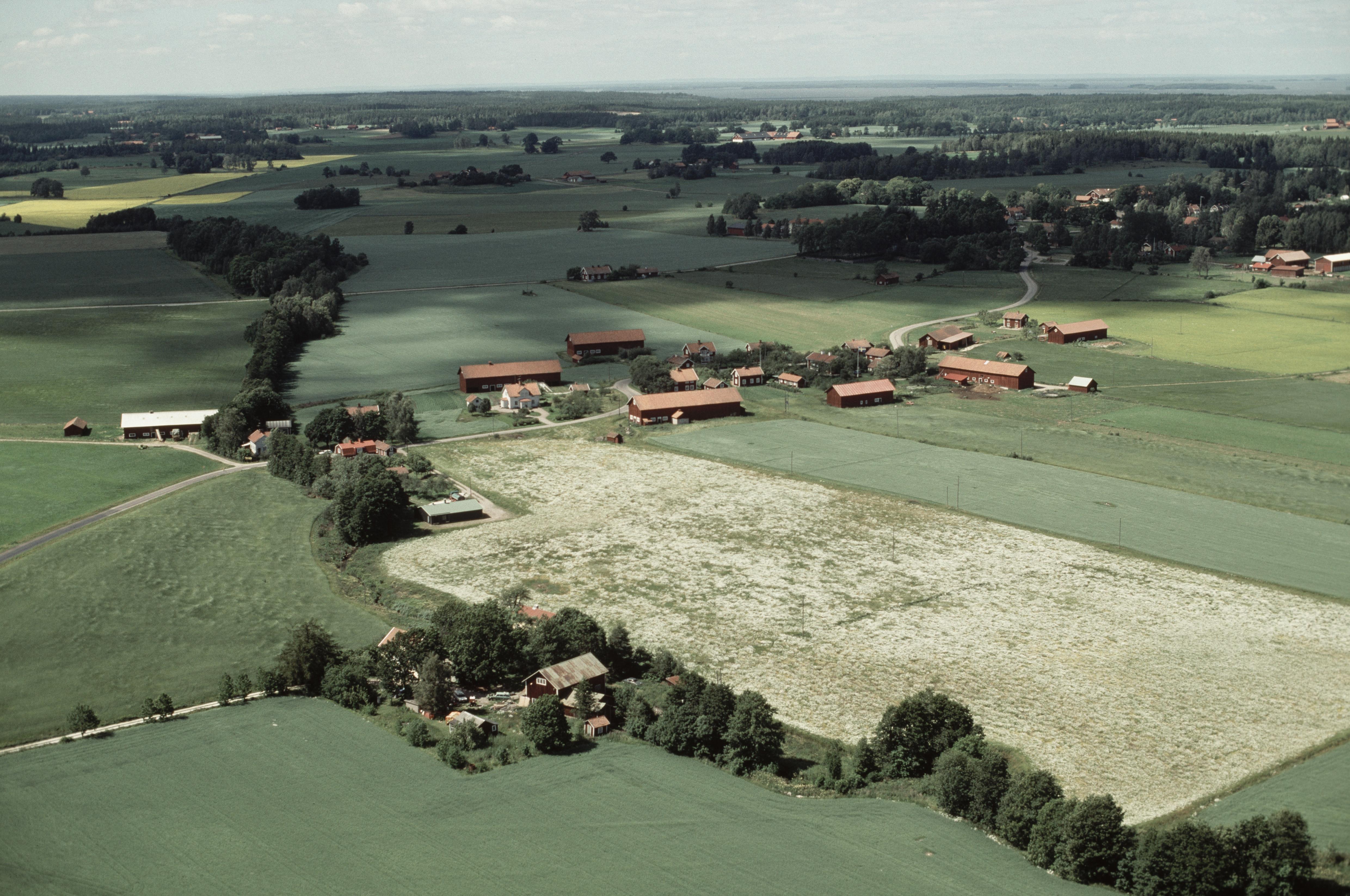 Beskrivning: Hulla by. Hullafors gård nere till vänster vid Gärsån. Uppe till höger Österåkers kyrkby. Bilden är tagen mot (väderstreck): VNV