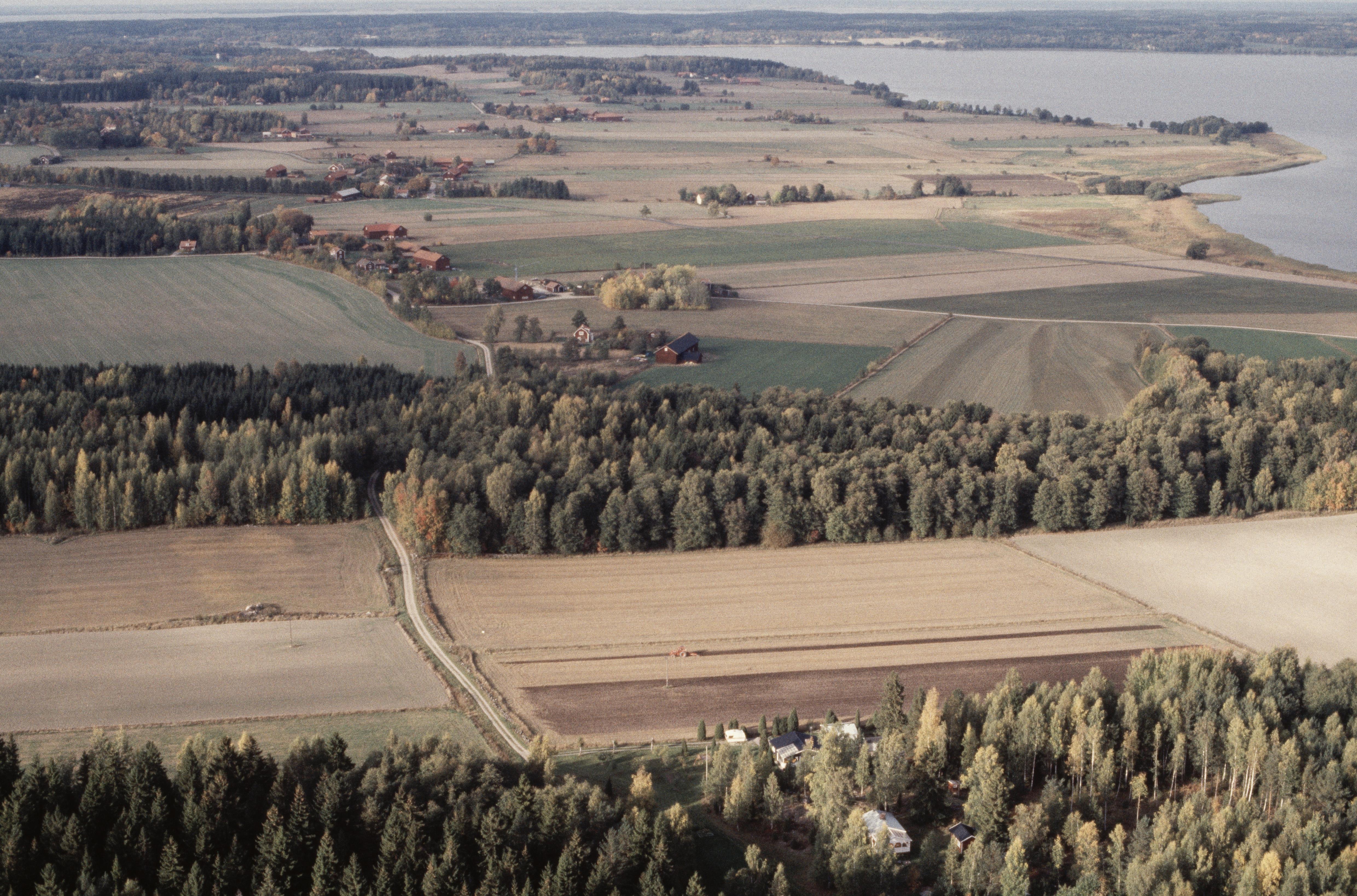 Beskrivning: Hulla by vid sjön Öljaren. Till vänster om bildens mitt fyndplats (stenyxor) RAÄnr Österåker 3:1 i Hulla by vid Gärsån. Uppe till vänster Österåkers kyrkby. Bilden är tagen mot (väderstreck): N