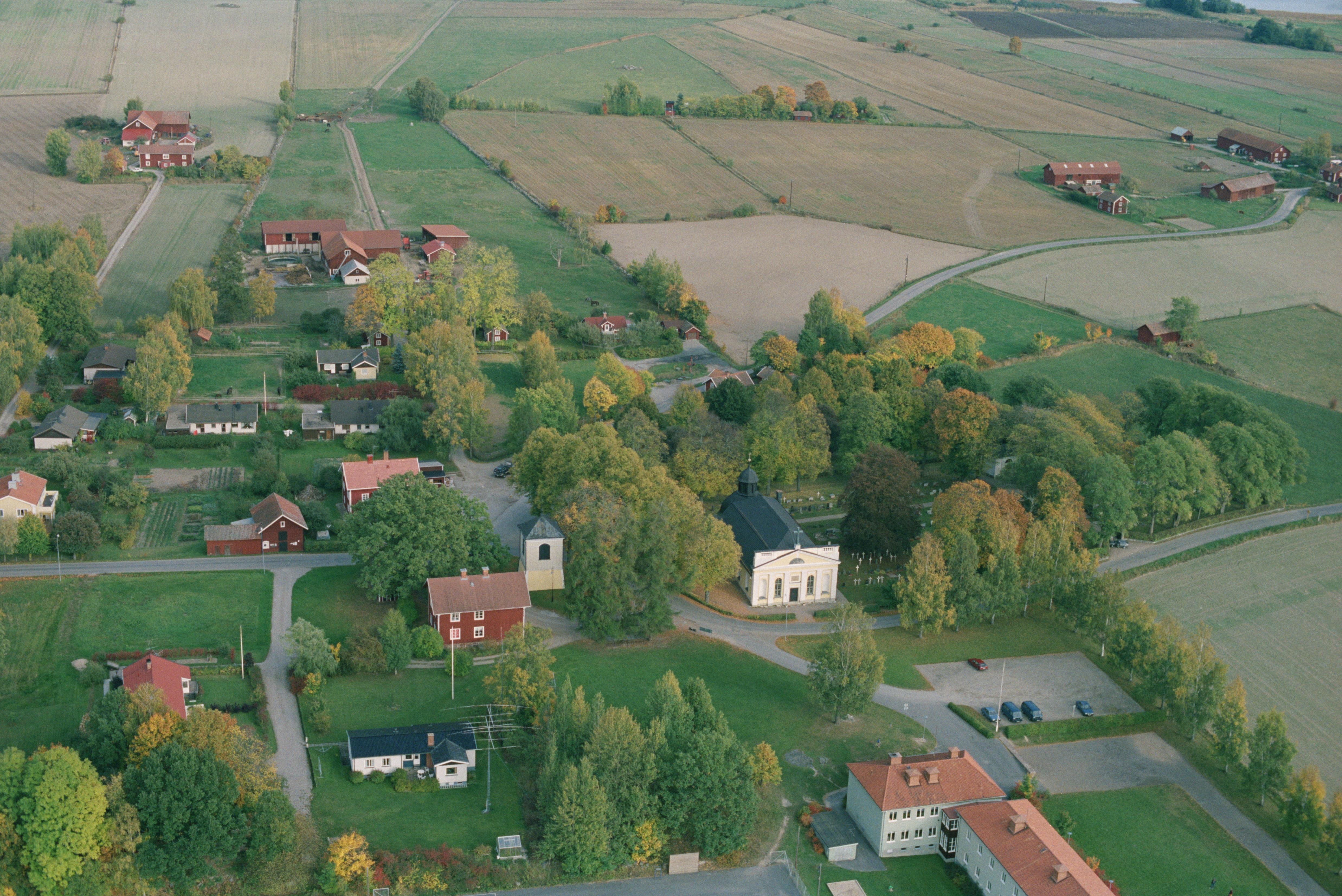 Beskrivning: Österåkers kyrka och kyrkby. Bilden är tagen mot (väderstreck): Ö