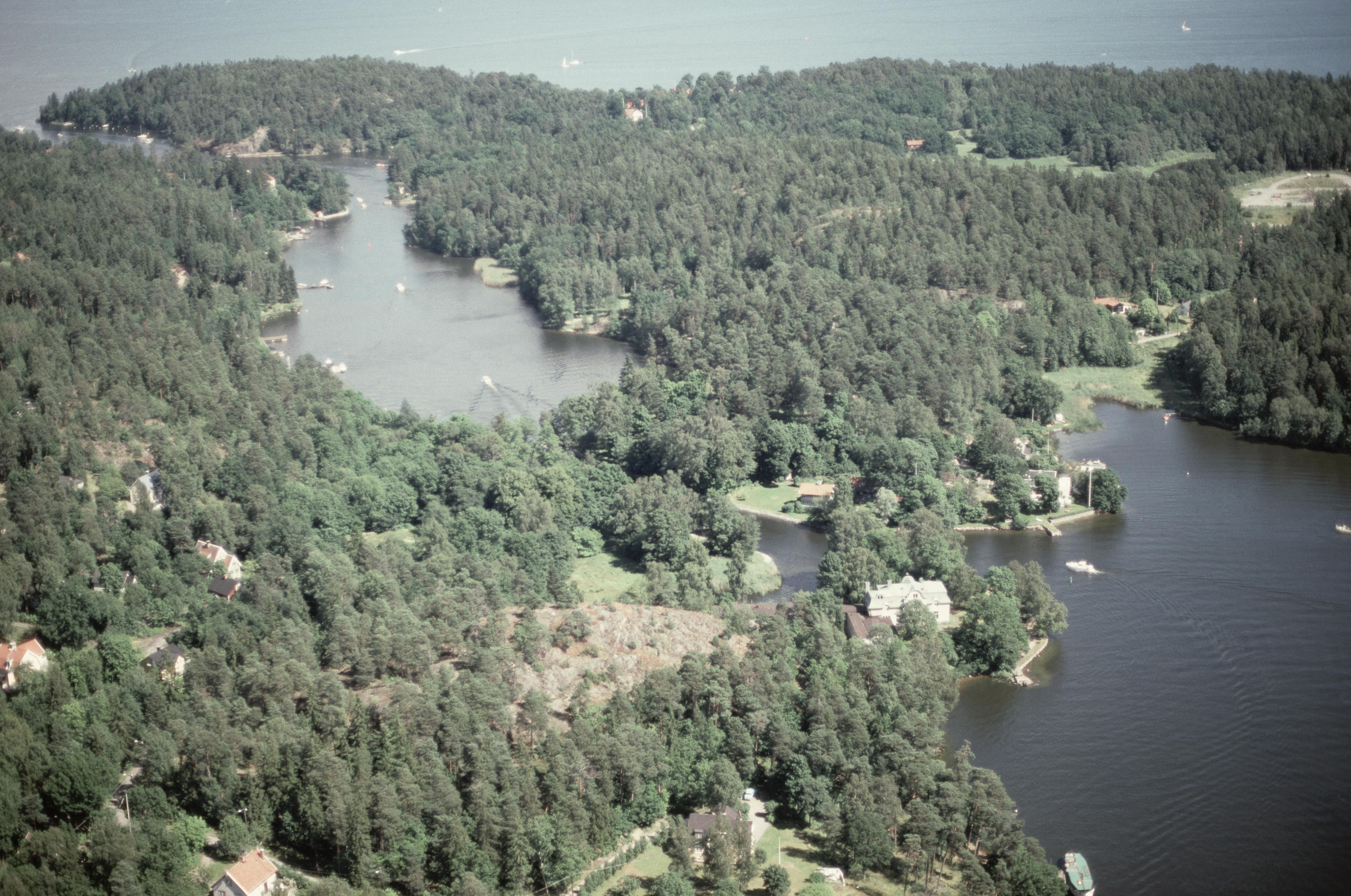 Beskrivning: Stäket och Fladen mellan Lännersta och Skogsö vid Lännerstasundet (i bildens nedre del). Skansar RAÄnr Boo 18:1 och RAÄnr Nacka 166:1 i bildens mitt. Bilden är tagen mot (väderstreck): ONO