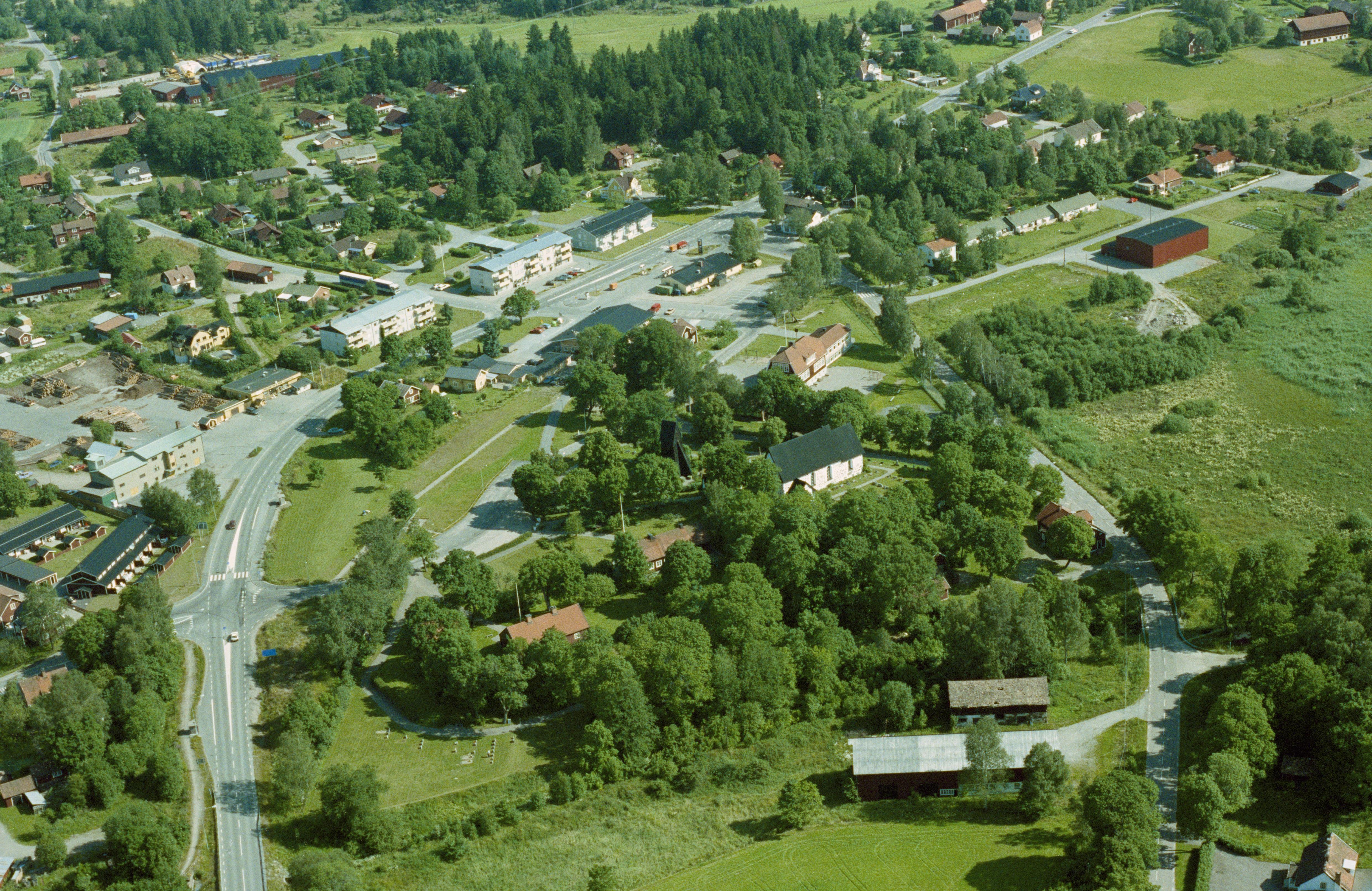 Beskrivning: Edsbro kyrka i Edsbo bruk vid bildens mitt. I bildens övre del hyttområde och masugn RAÄnr Edsbro 250:1-5. Bilden är tagen mot (väderstreck): SV