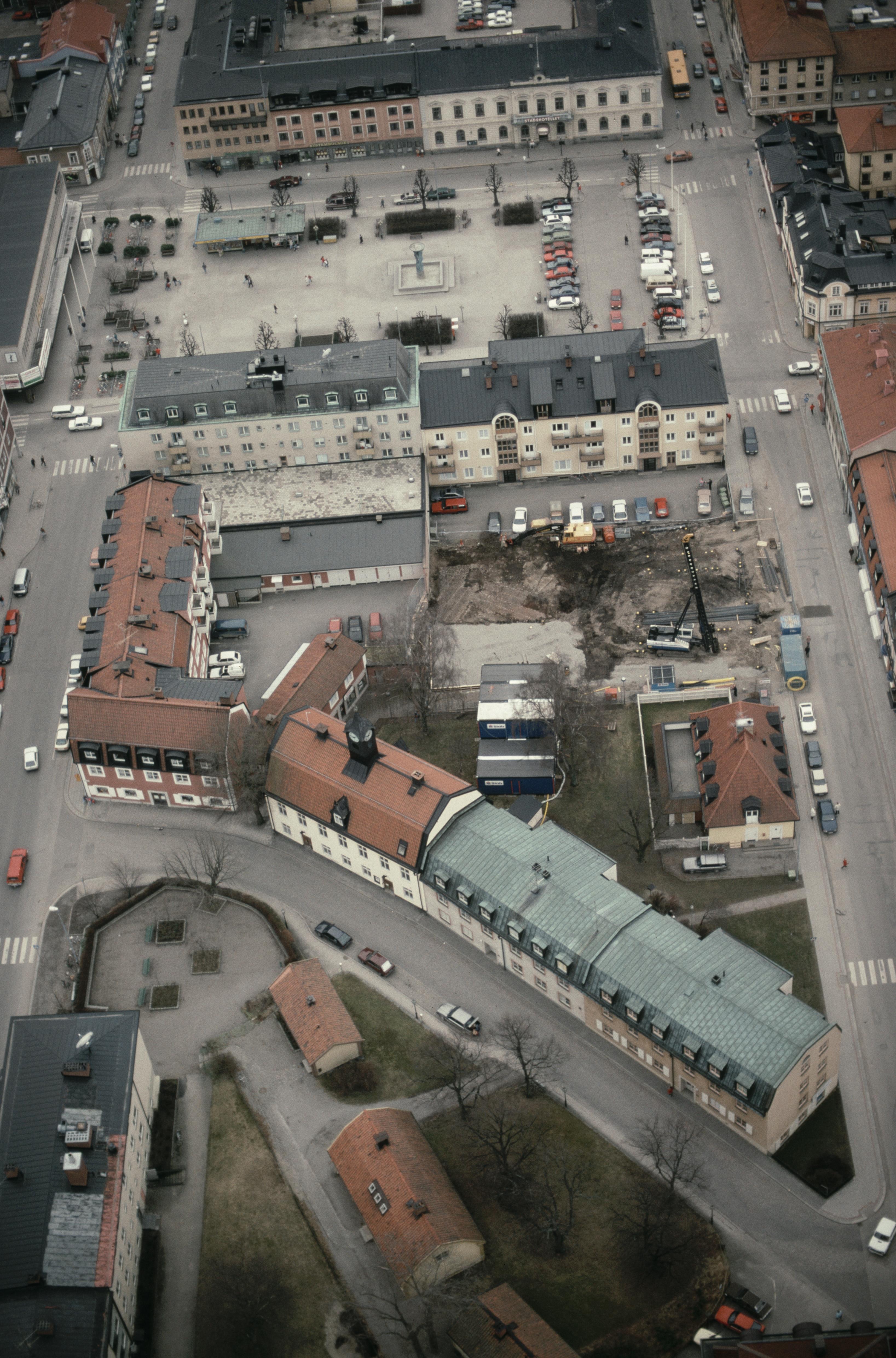 Beskrivning: Beskrivning: Enköpings stad. Arkeologisk undersökning av stadslager RAÄnr Enköping 26:1 i kvarteret Borgmästaren. Bilden är tagen mot (väderstreck): SV Fotosyfte: Flygbildsdokumentation